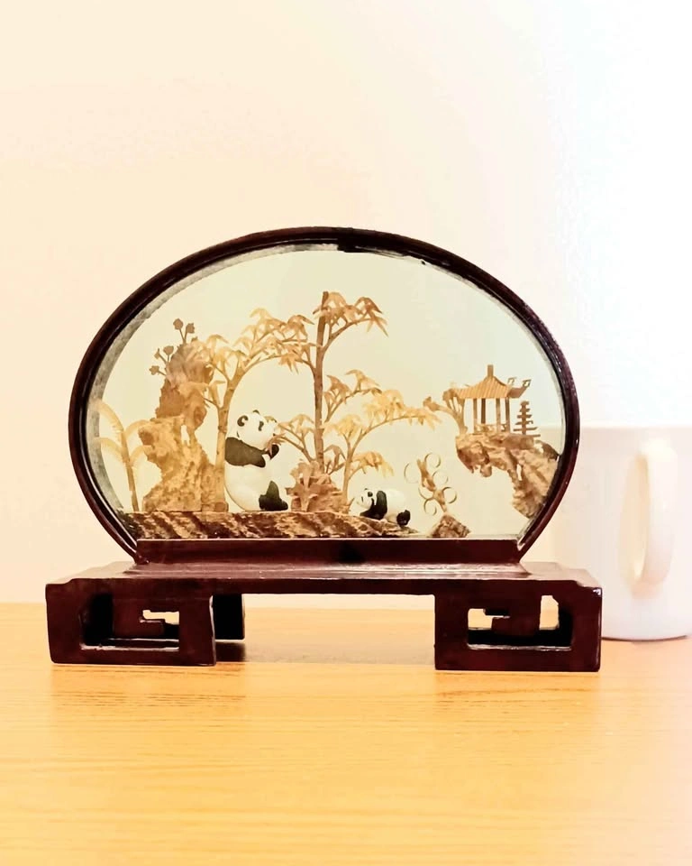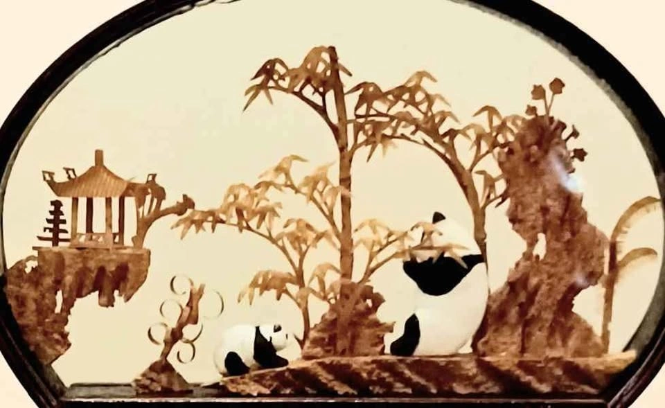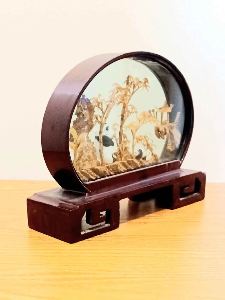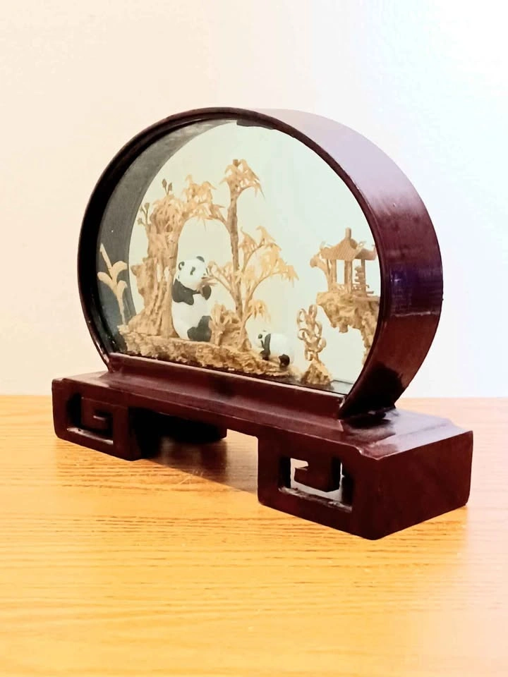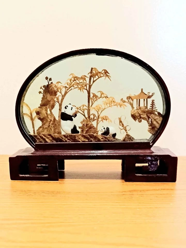65Vintage, Chinese Art, Decorative, Household Rare Diorama, Hand Carved Cork, Pandas, Trees Excellent Condition Please check out my other rare collectibles!