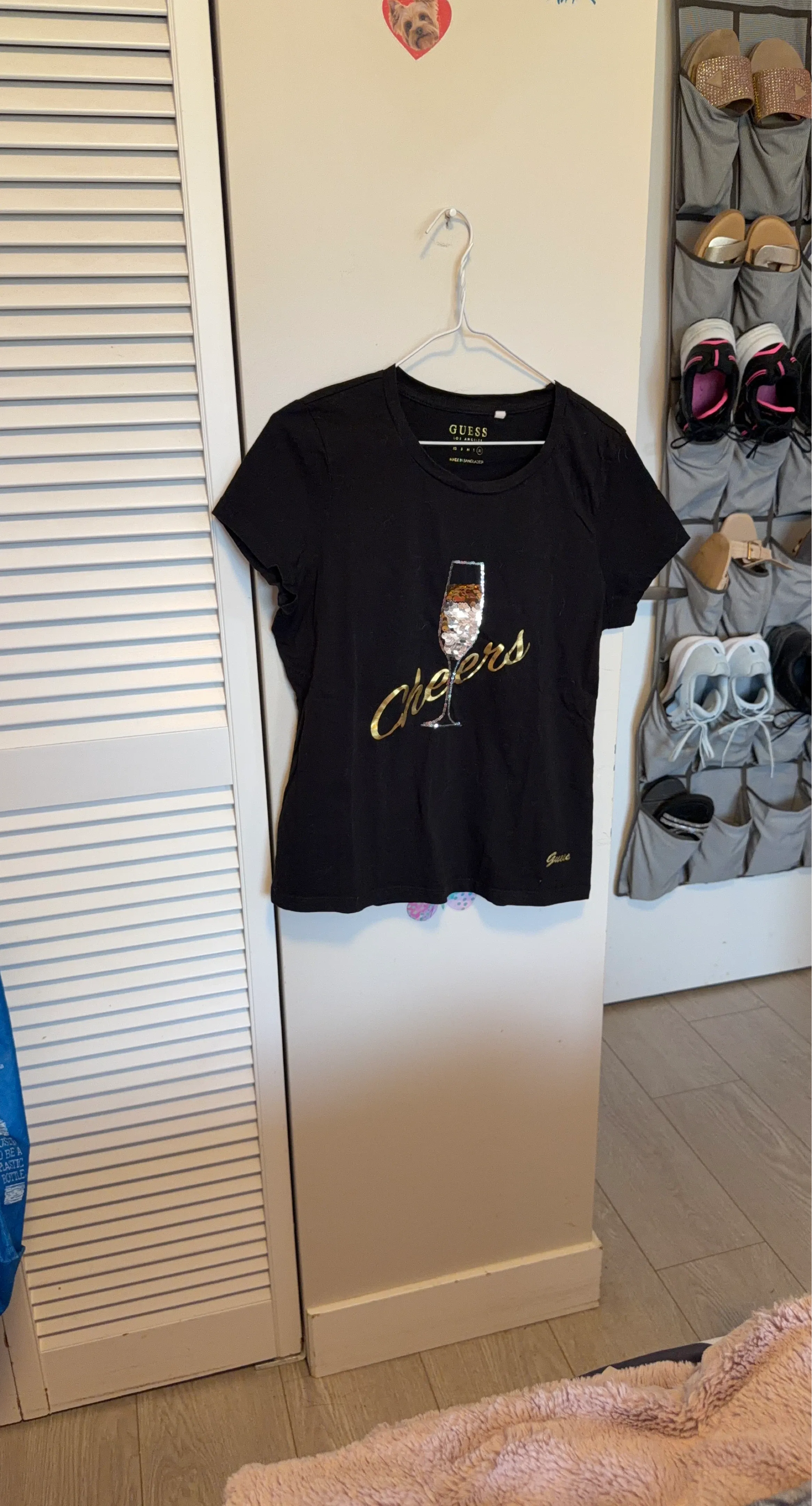 Guess black t-shirt featuring a fun champagne glass graphic with sequins. It's a stylish top for a casual outing or a celebration. Made from a comfortable fabric blend.