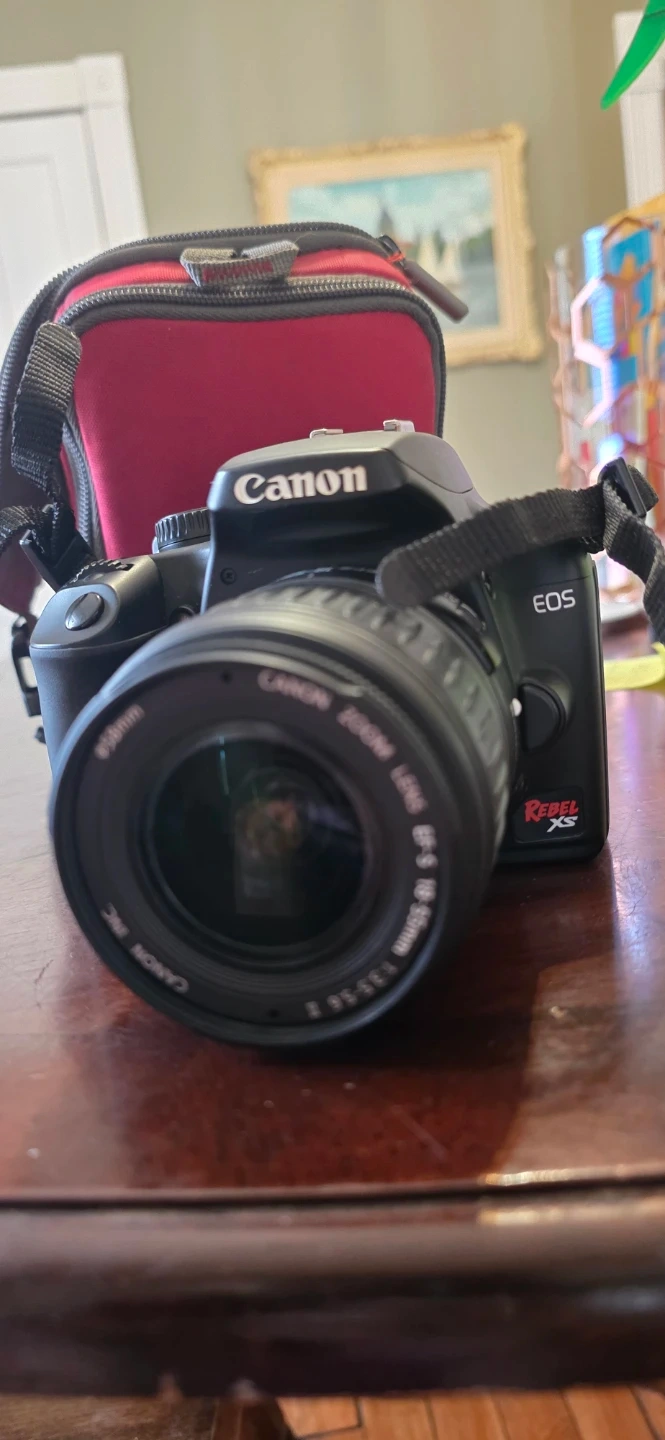 Canon EOS Rebel XS DSLR camera with a 18-55mm lens included. This camera is in good condition and comes with a red carrying case. It's a great option for beginners looking to get into digital photography.