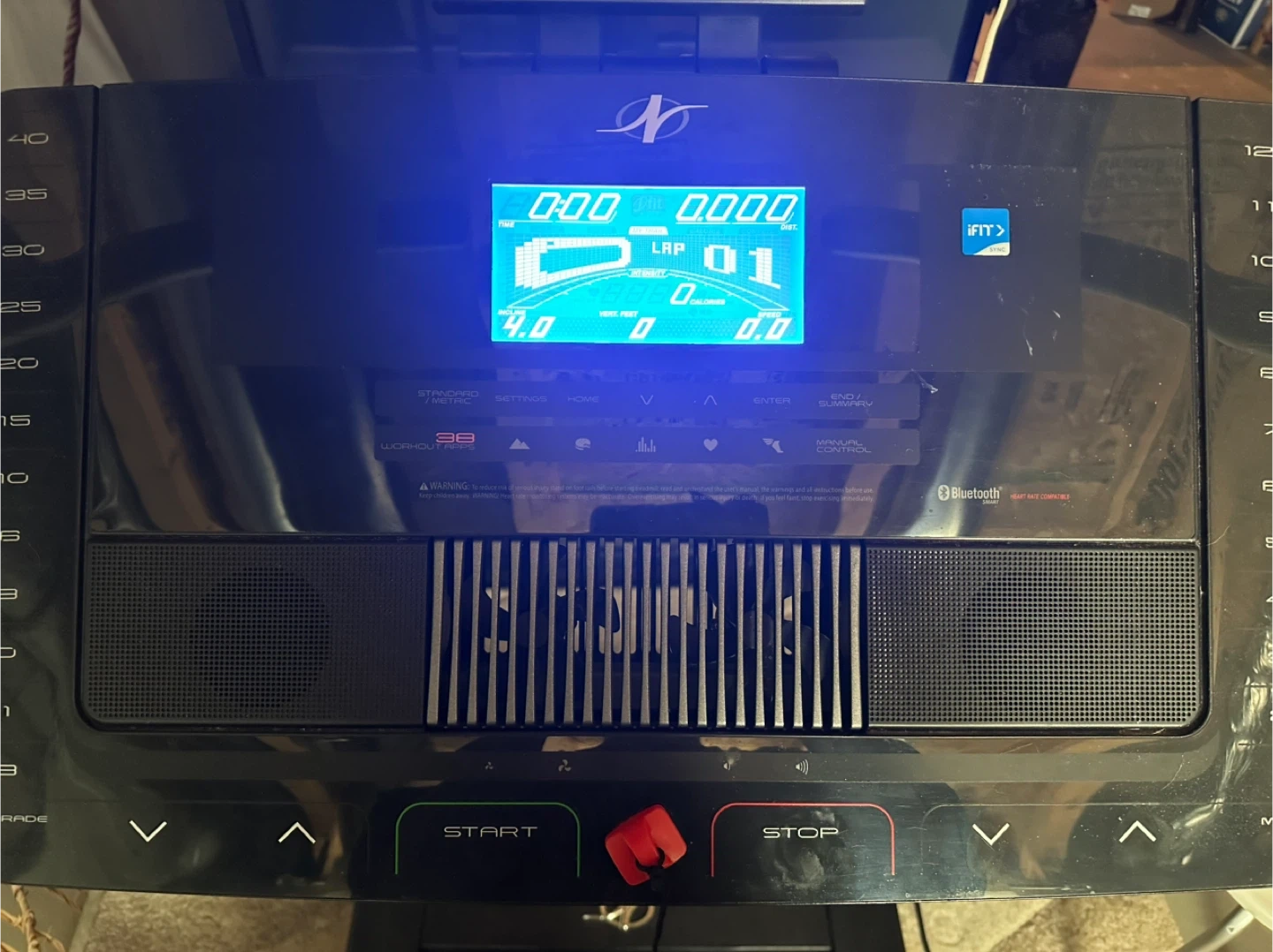 NordicTrack X7i Incline Trainer treadmill. It has a large digital display showing speed, time, distance, and calories burned. Bluetooth compatible for your convenience.