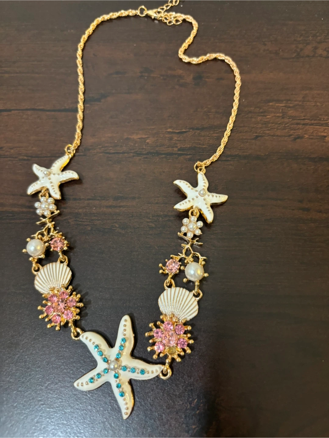 This gold tone necklace features a charming nautical design. It's adorned with white starfish charms accented with blue rhinestones, pink gems, and faux pearls. Seashell charms add a lovely detail.