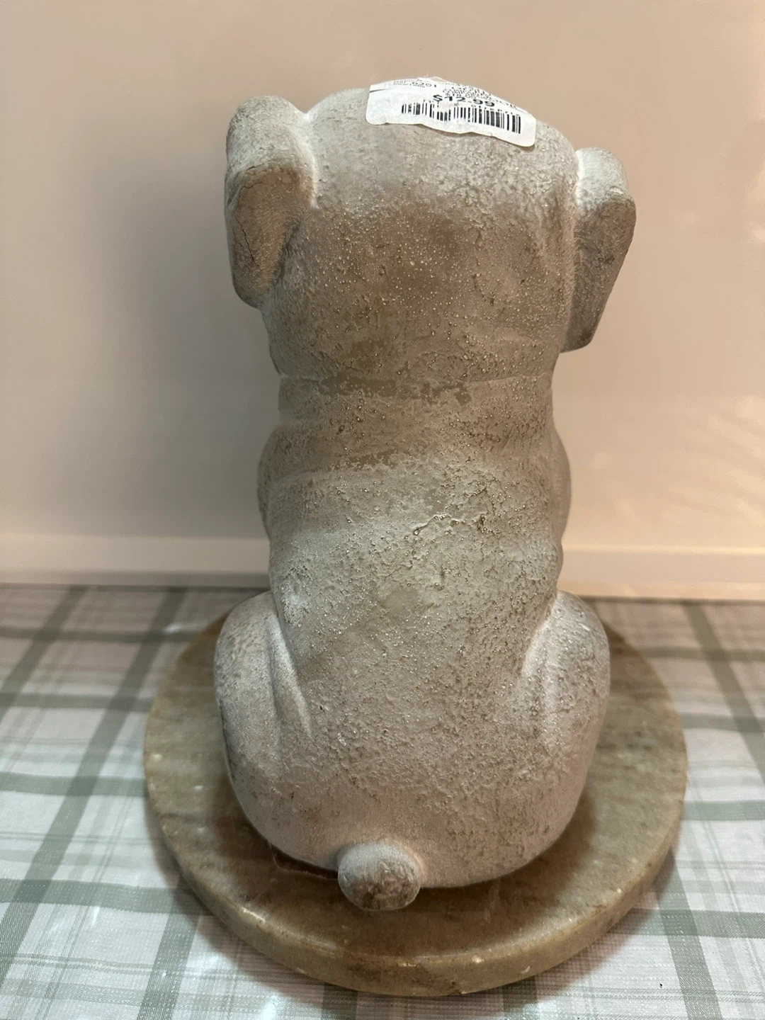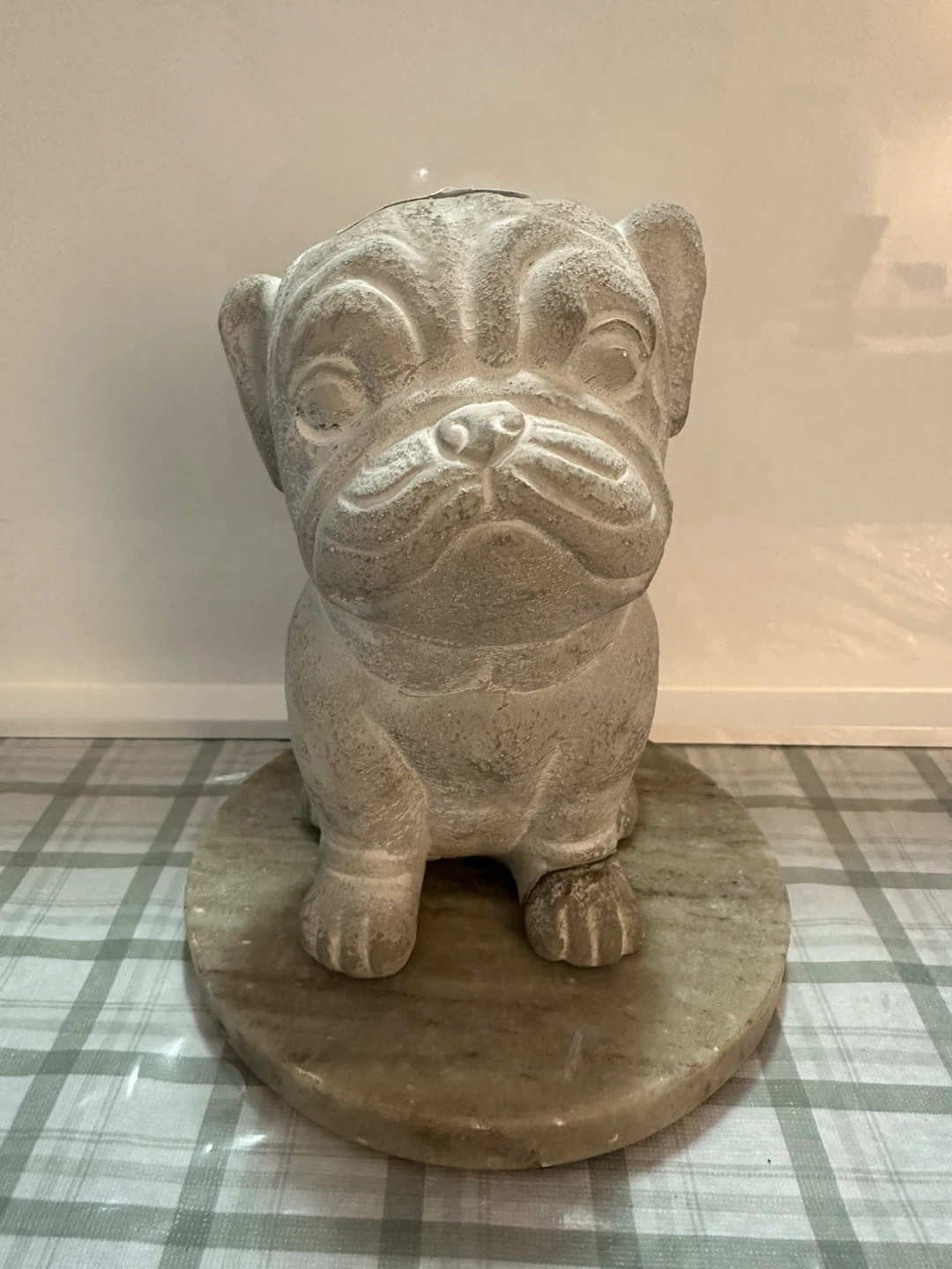 This is a concrete-style dog statue on a marble base. It's designed to look like a pug or bulldog. This would make a cute addition to a garden or shelf!
