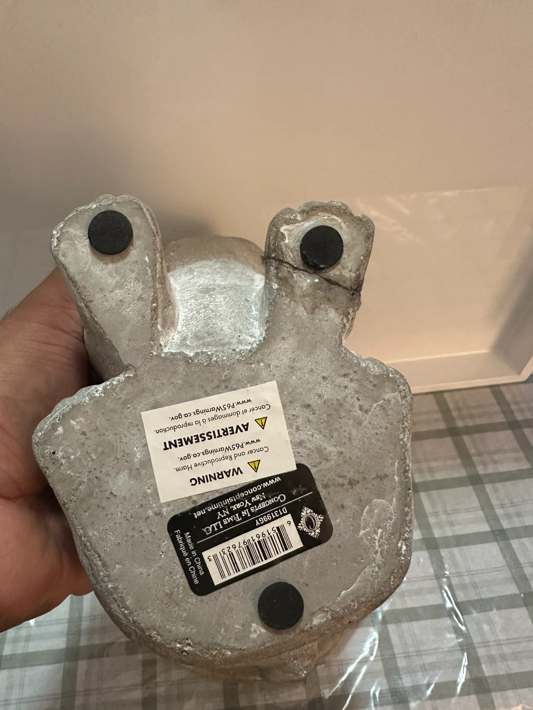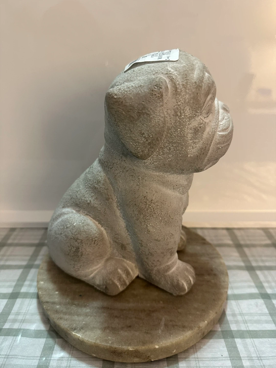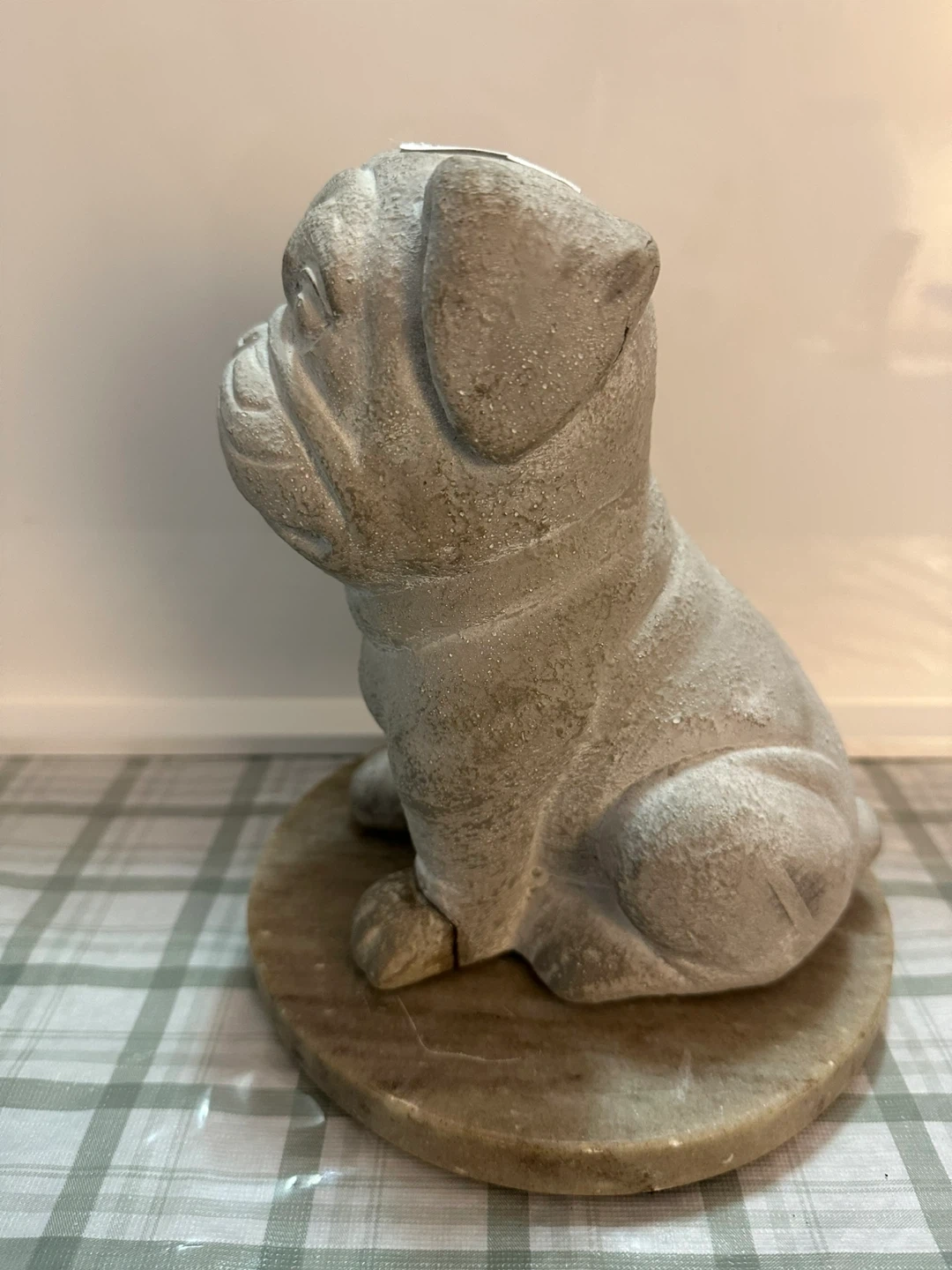 This is a concrete-style dog statue on a marble base. It's designed to look like a pug or bulldog. This would make a cute addition to a garden or shelf!