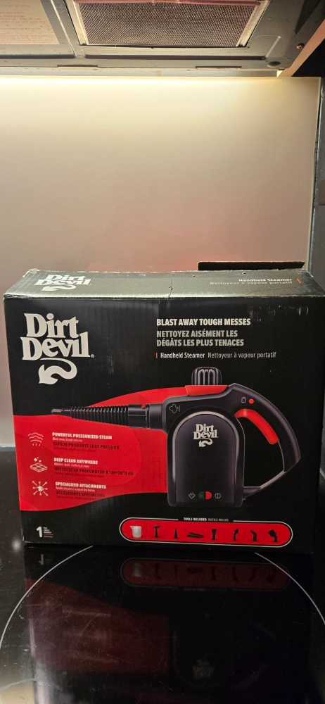 Selling a brand new Dirt Devil handheld steamer, still in its original box! It's perfect for blasting away tough messes with its powerful pressurized steam. It can deep clean anywhere and comes with specialized attachments. Get your cleaning done easily!