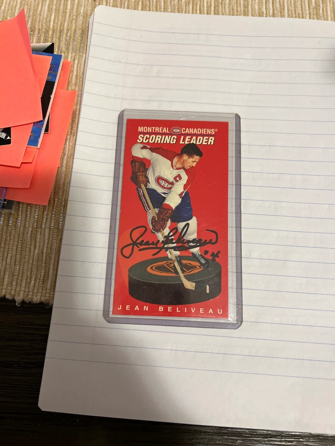 Two vintage hockey cards featuring Norm Ullman of the Detroit Red Wings and Jean Beliveau of the Montreal Canadiens. Both cards are signed. The Norm Ullman card includes stats from the 1964-65 season. The Jean Beliveau card is from the 1963-64 scoring leaders set.