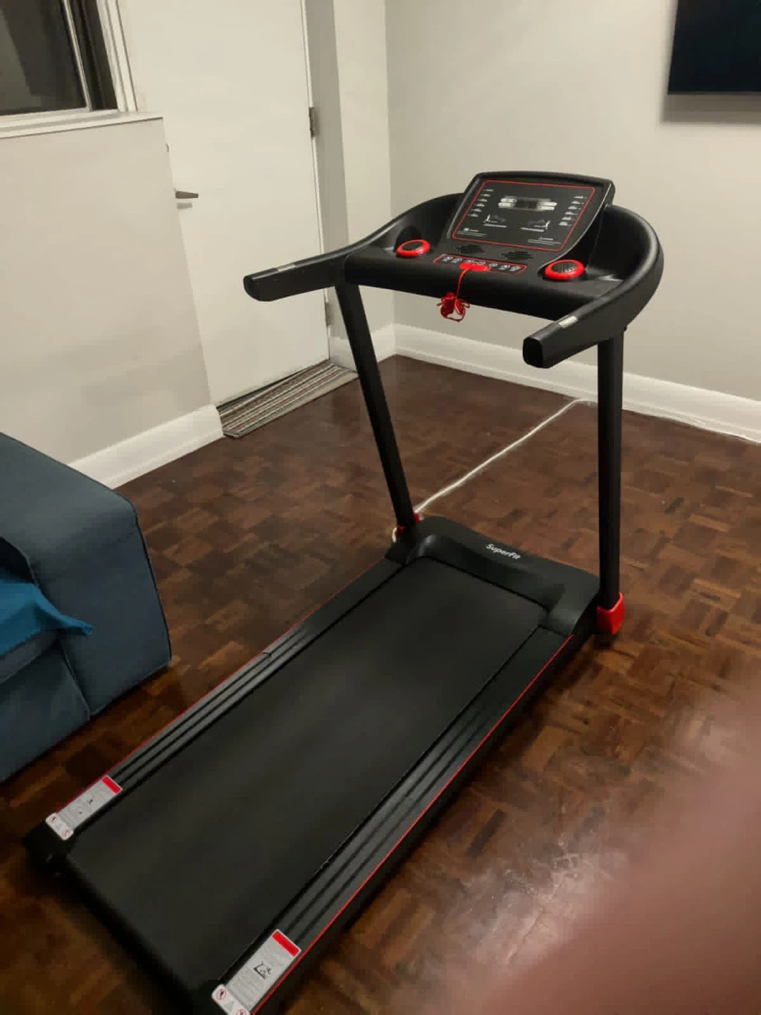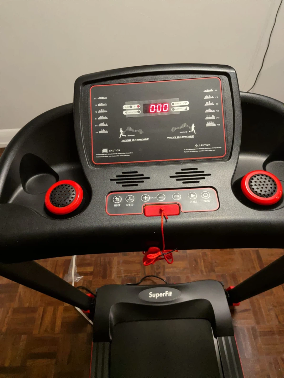 This SuperFit treadmill is perfect for your home workouts. It features multiple program options and a clear digital display for tracking your progress. Easy to fold and store.