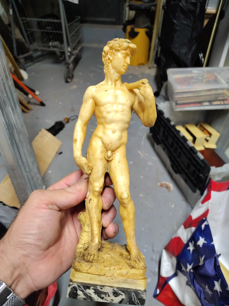 Selling a David statue figurine. It has a marble-like base and appears to be made of a resin or similar material. It shows some signs of wear and could use a cleaning.