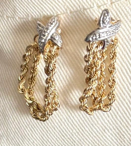 Beautiful 10K yellow gold double rope chain dangle earrings with white gold knot detailing. The earrings have post backs with butterfly nut backs attached to the rope chain to prevent loss. Stamped 10K. Total weight is 2.20 grams of 10K yellow gold. All my items are real gold. Cash only sale. Transactions will be conducted at Glenview Police Department or Morton Grove PD. Please check out my other listings. Thank you!