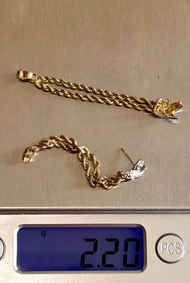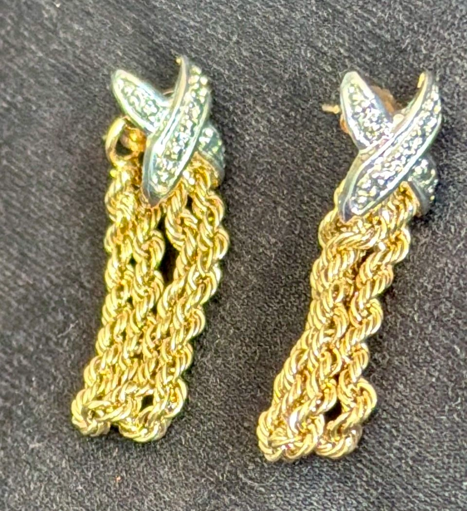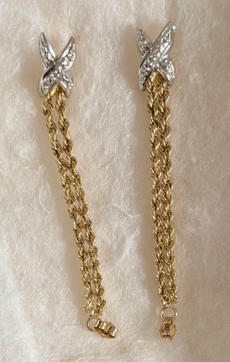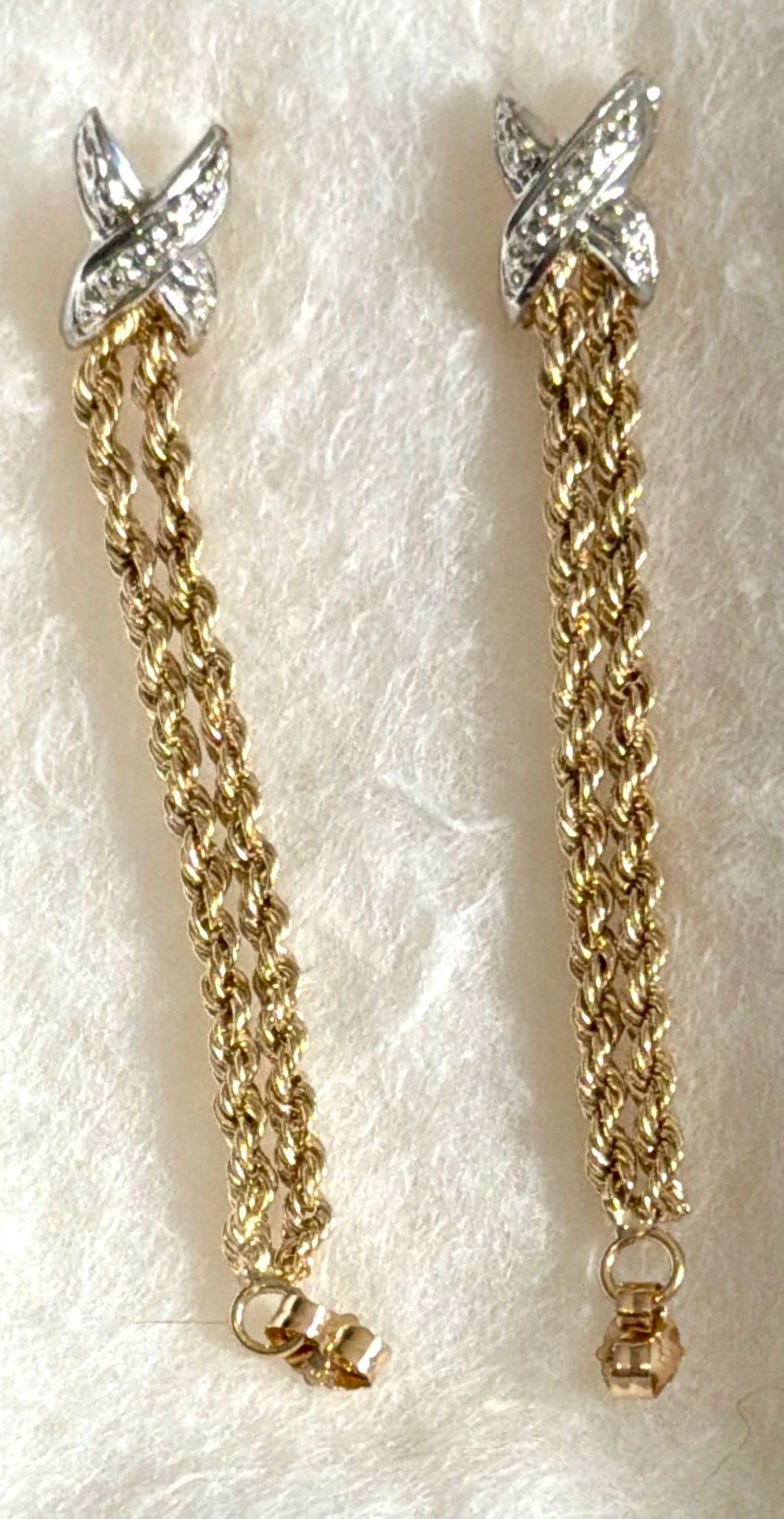 Beautiful 10K yellow gold double rope chain dangle earrings with white gold knot detailing. The earrings have post backs with butterfly nut backs attached to the rope chain to prevent loss. Stamped 10K. Total weight is 2.20 grams of 10K yellow gold. All my items are real gold. Cash only sale. Transactions will be conducted at Glenview Police Department or Morton Grove PD. Please check out my other listings. Thank you!