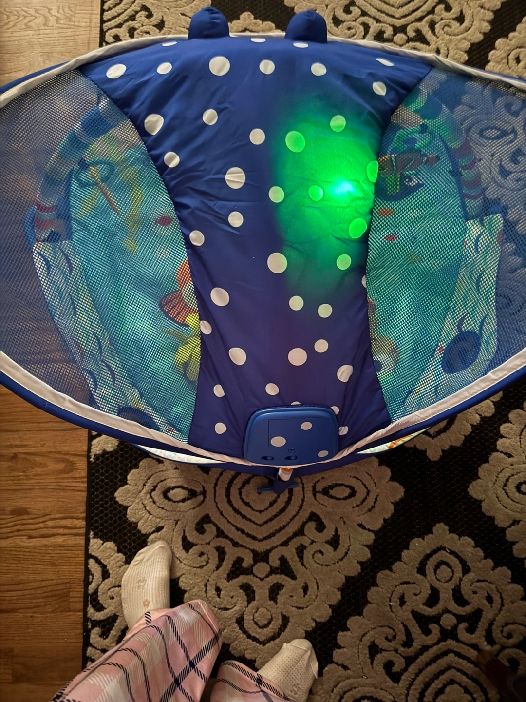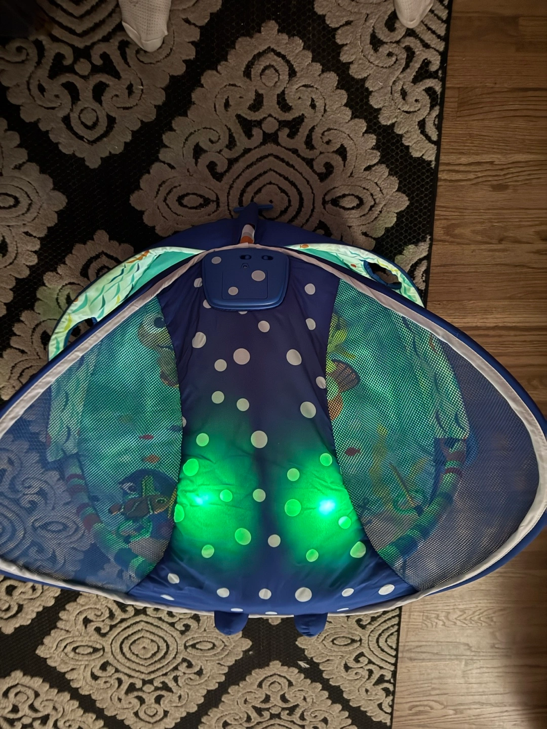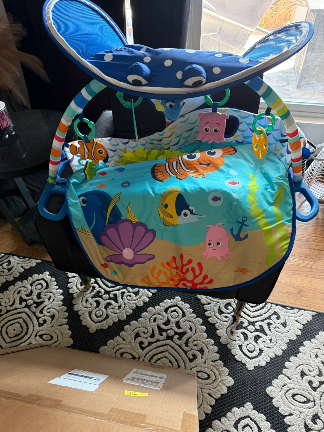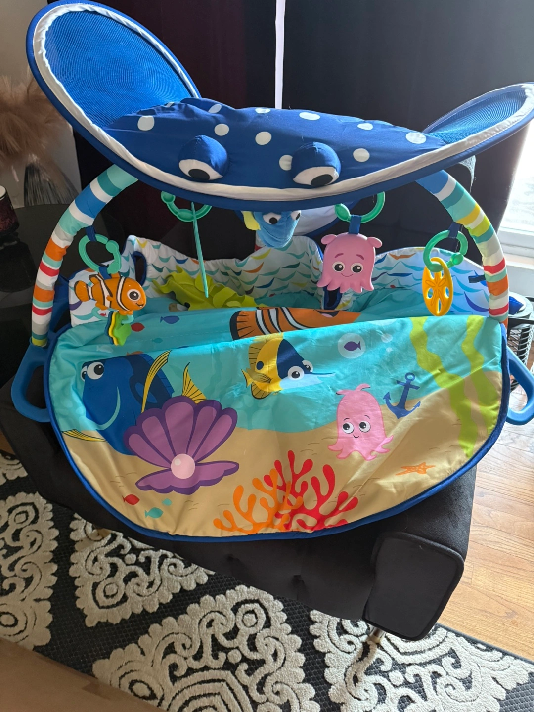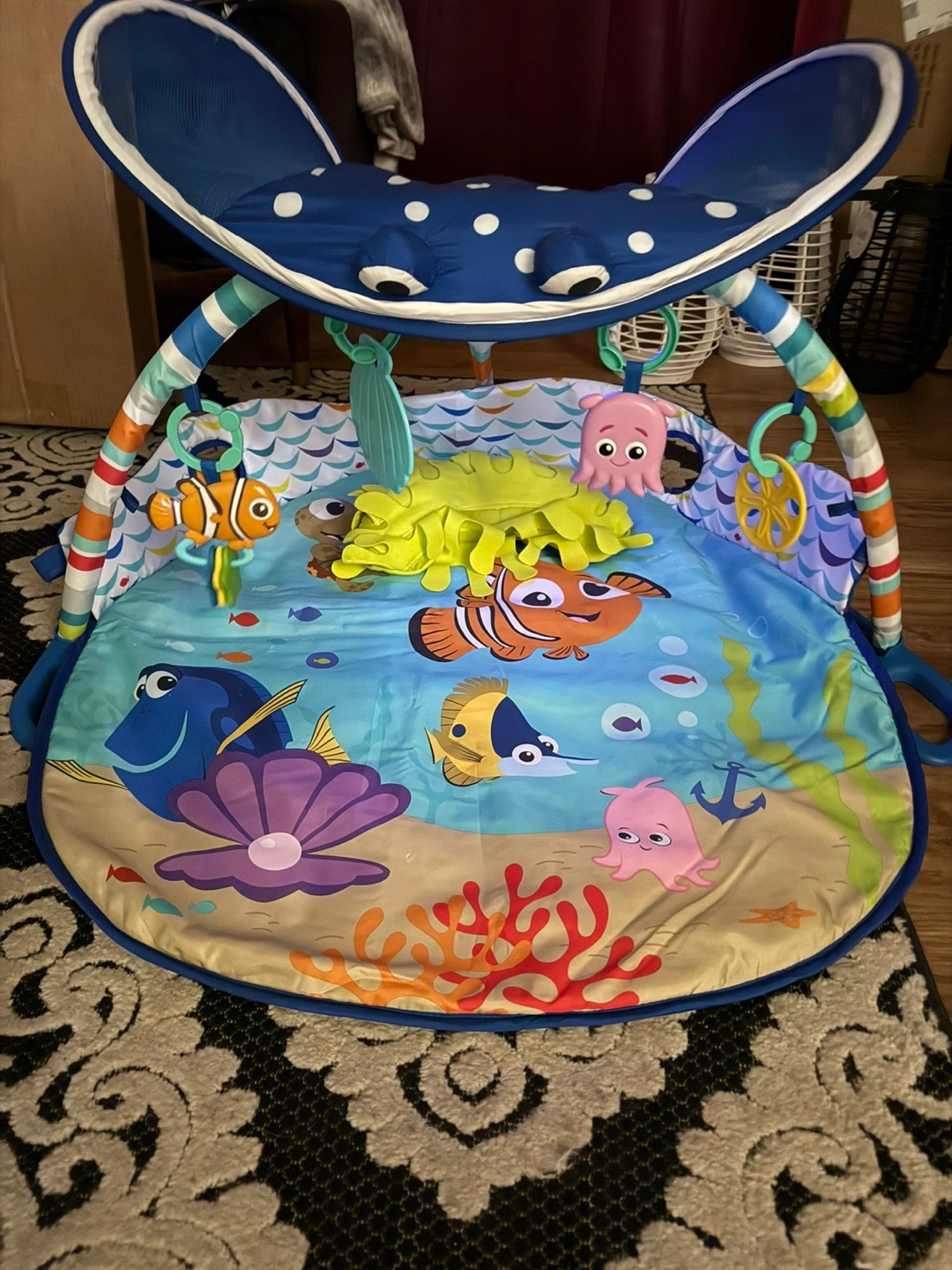 Disney Baby Mr Ray Ocean Lights Activity Gym Mr. Ray Canopy creates a captivating environment for baby to play and experience with lights and music 20+ minutes of ocean themed melodies for baby to kick and play for fun and auditory stimulation Dory finger puppet for Finding Nemo storytelling during co-play between parent and baby 5 additional Finding Nemo themed activity toys including baby-safe self-discovery clamshell mirror, Squirt rattle filled with colorful beads, Nemo bead chaser, tug-able Pearl the octopus, and sand dollar teether Contoured tummy time pillow for added support with seaweed-inspired theme to bring Nemo's environment to life