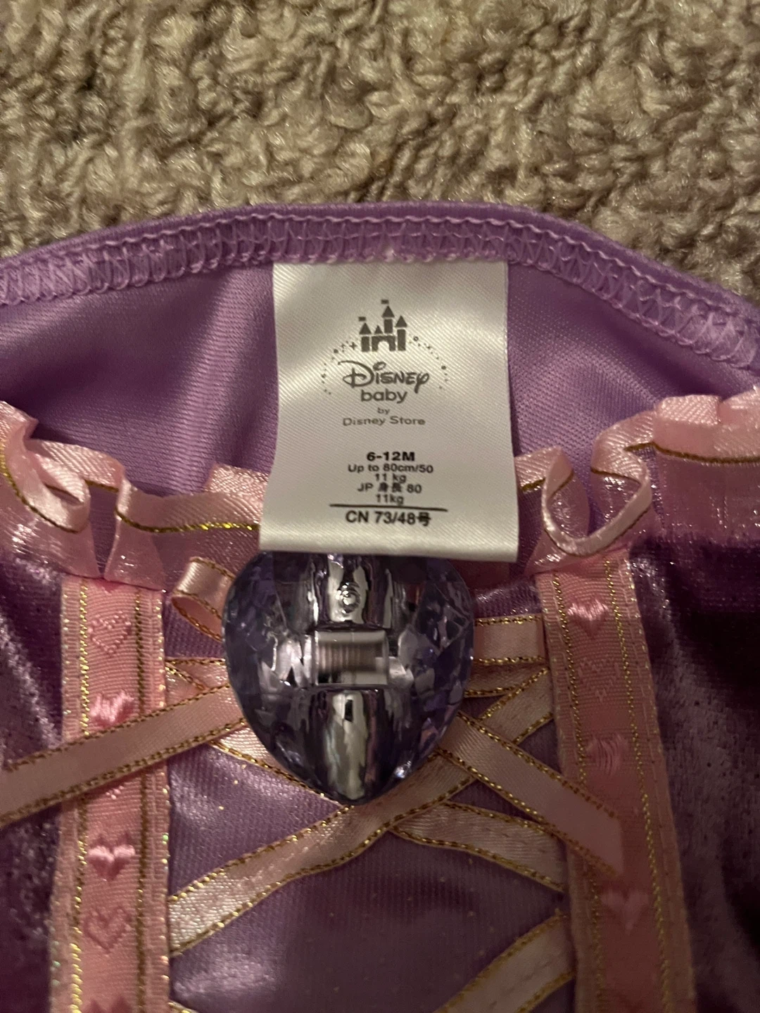 65A cute Rapunzel dress from Disney Baby! It's sized for 6-12 months, up to 80cm/31.5 inches and 11kg. Perfect for your little princess!