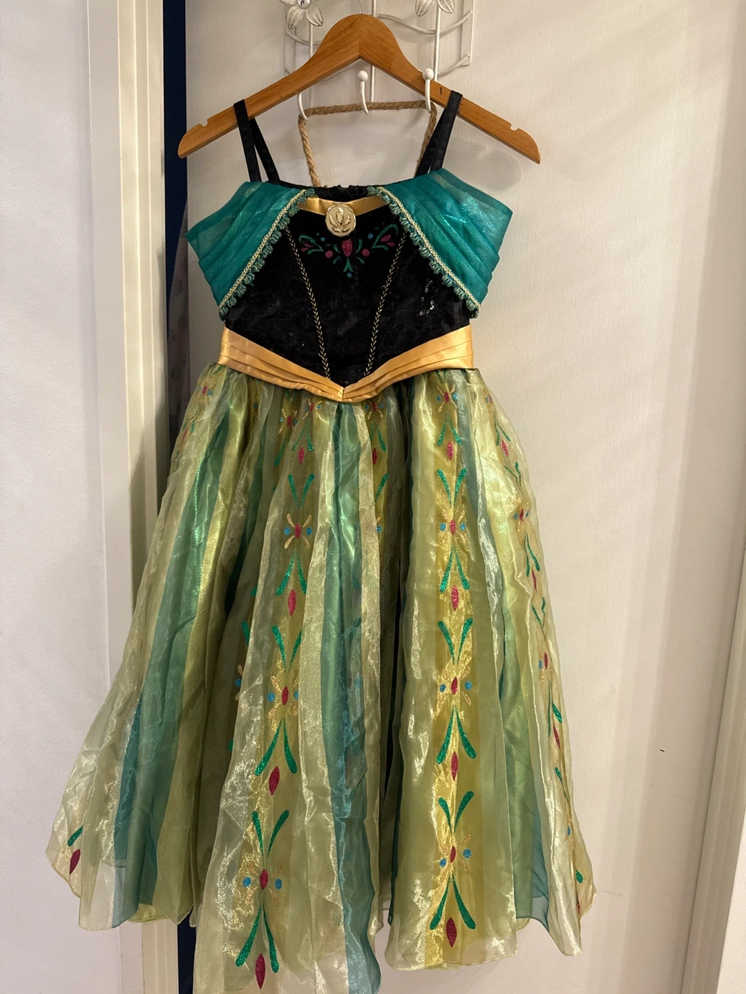 10Selling an Anna dress from Disney's Frozen. It's in great condition and perfect for any little fan of the movie! The dress features beautiful detailing and vibrant colours, making it a standout costume for dress-up or special occasions. Purchased from Disney Store