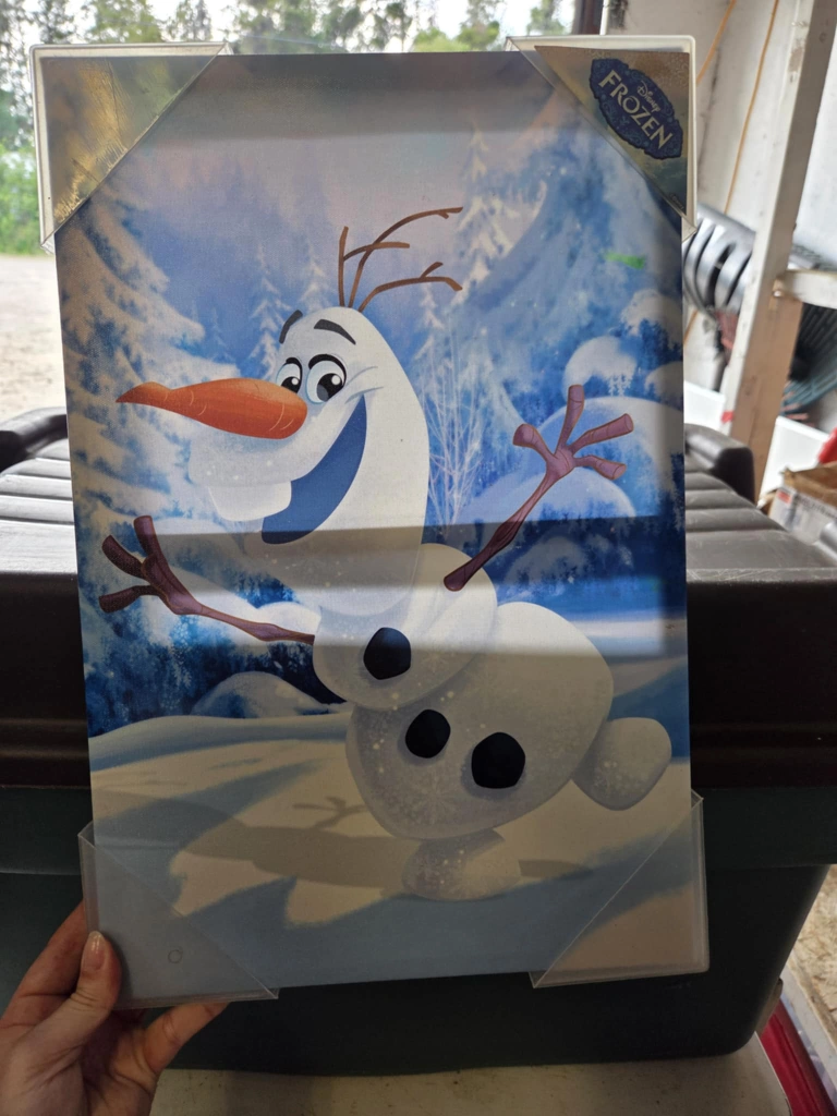 Olaf the snowman featured. A winter landscape with Olaf's smiling face. Could make a cozy accent for a child's room.