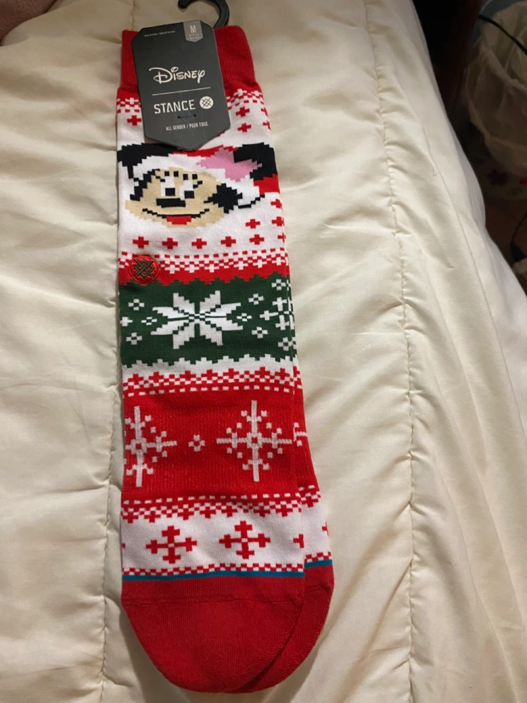 106These Disney Stance socks are perfect for adding a touch of fun to your everyday wear! They feature a festive design with Minnie Mouse and snowflakes. The size is M. $27.99 retail