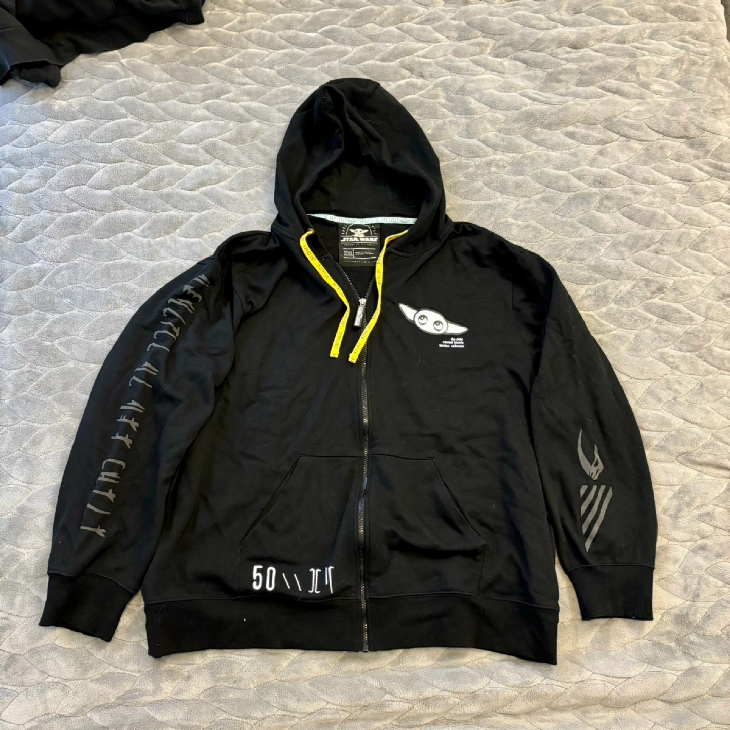 174Star Wars hoodie from the Disney Parks brand, it is practically brand new, and is perfect for a fan of the Mandalorian! Black zip-up hoodie with a Baby Yoda design on the front and The Child text across the back. Yellow drawstring.