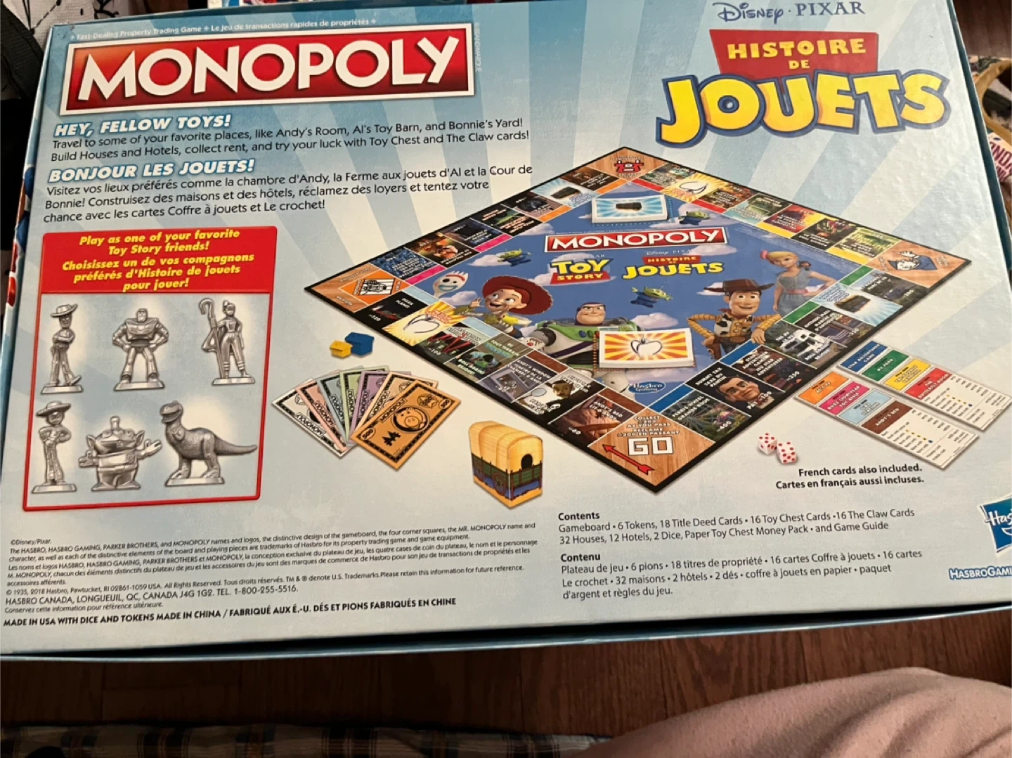 123Selling a gently used Disney Pixar Toy Story Monopoly board game! It comes with all the original pieces, including the gameboard, tokens, title deed cards, chance cards, houses, hotels, dice, play money, and the game guide. French cards are also included. Perfect for family game night!