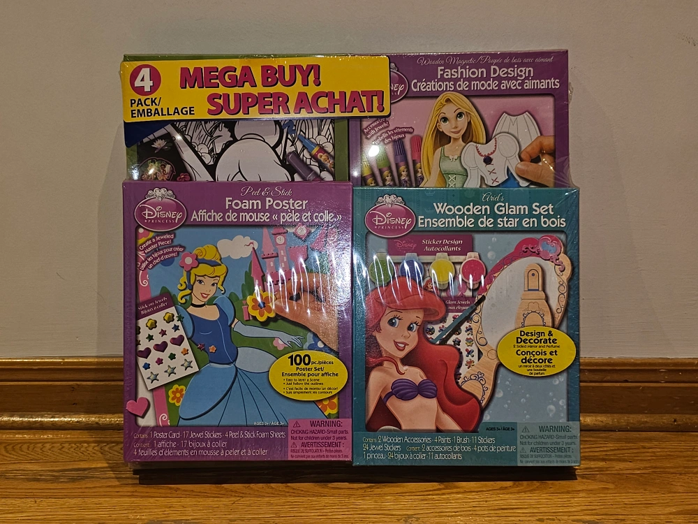 Set includes 4 Disney Princess themed craft activities: 1 foam poster, 1 wooden glam set, 1 fashion design set, and 1 colour-your-own poster.