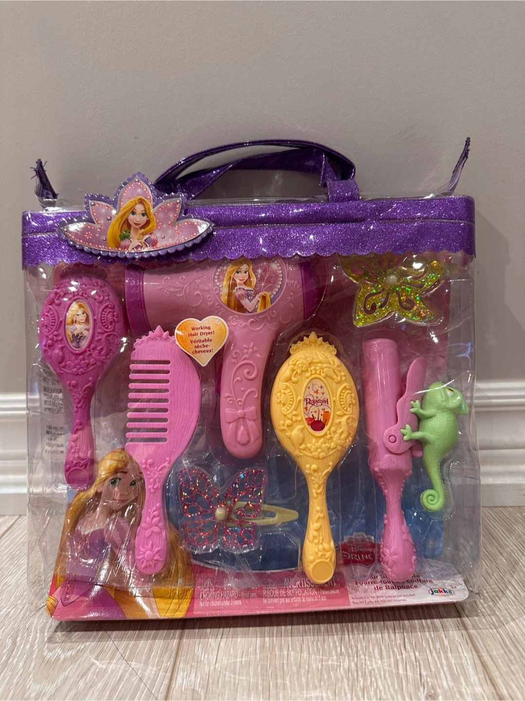 10Great Christmas gift for the little ones. Disney Princess Rapunzel Styling Tote includes a tote, working hair dryer, brush, mirror, comb, and two hair accessories. Perfect for any little Rapunzel fan who loves to play dress-up and style hair!
