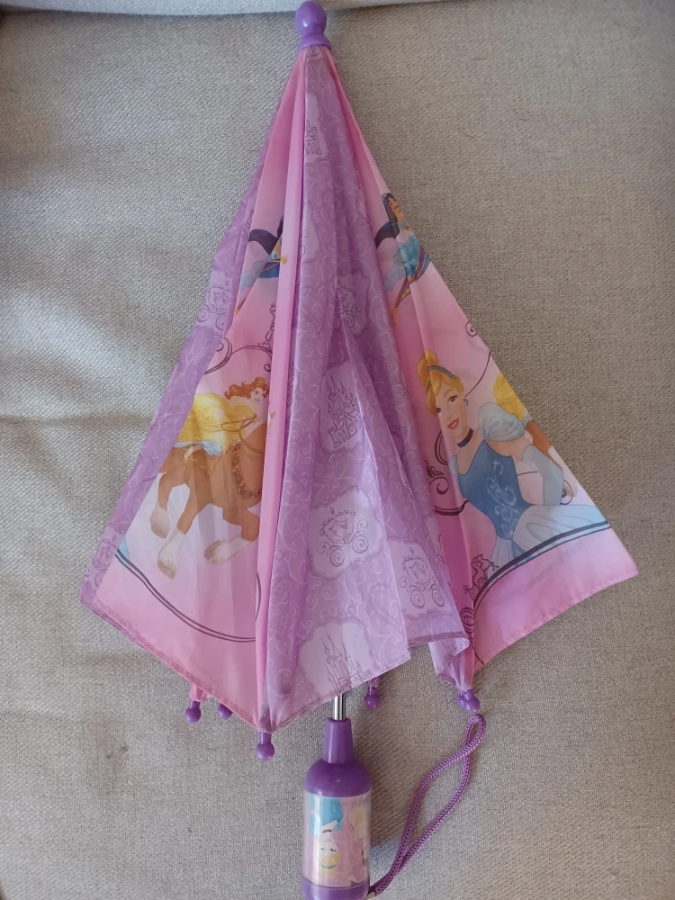 35A cute Disney Princess umbrella featuring Cinderella, Jasmine and Belle! It's in great shape and ready for rainy days. The umbrella is pink and purple with princess graphics all over