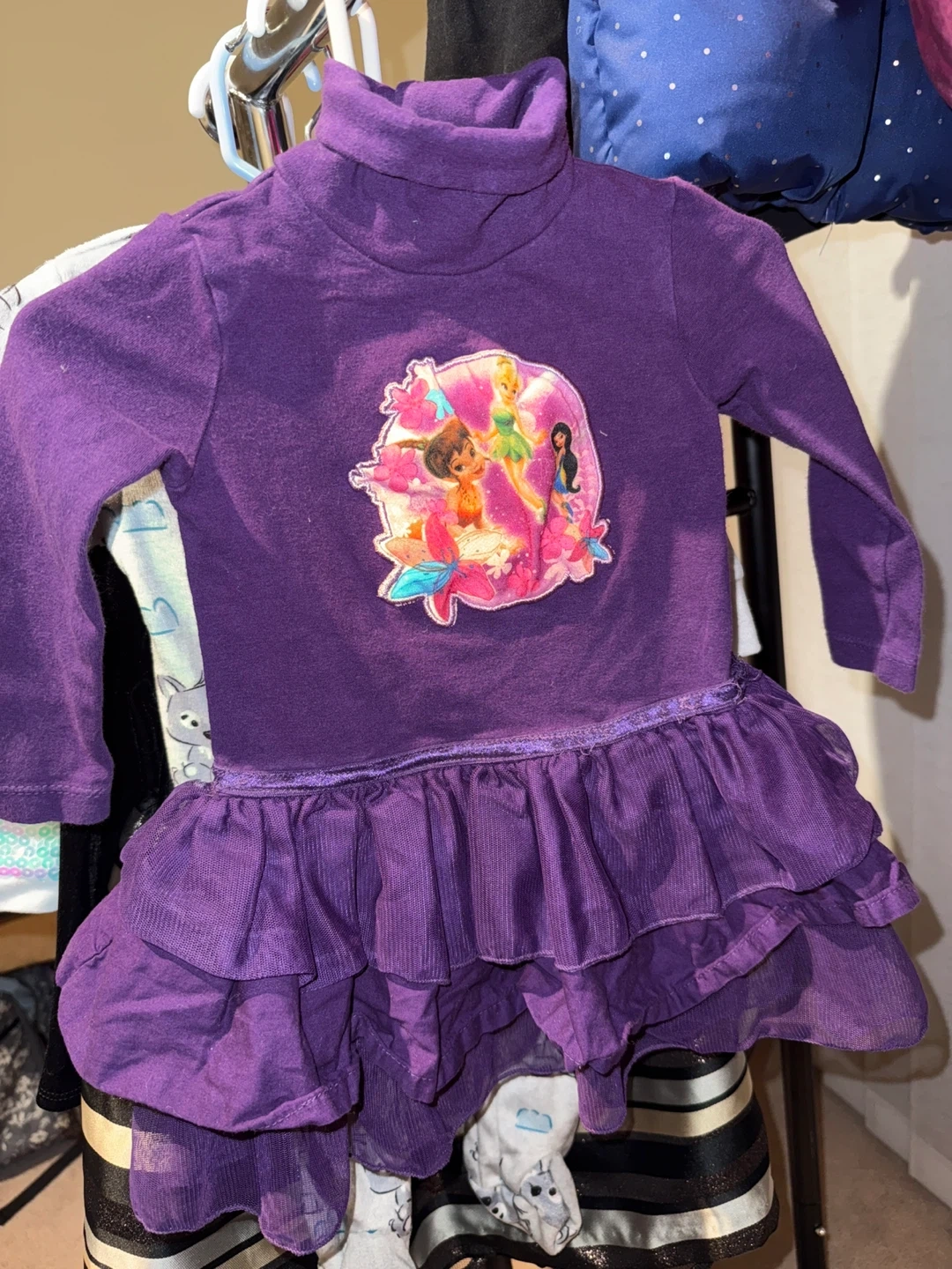 75A cute purple dress featuring Tinkerbell and friends! It's in great condition and perfect for any Disney lover