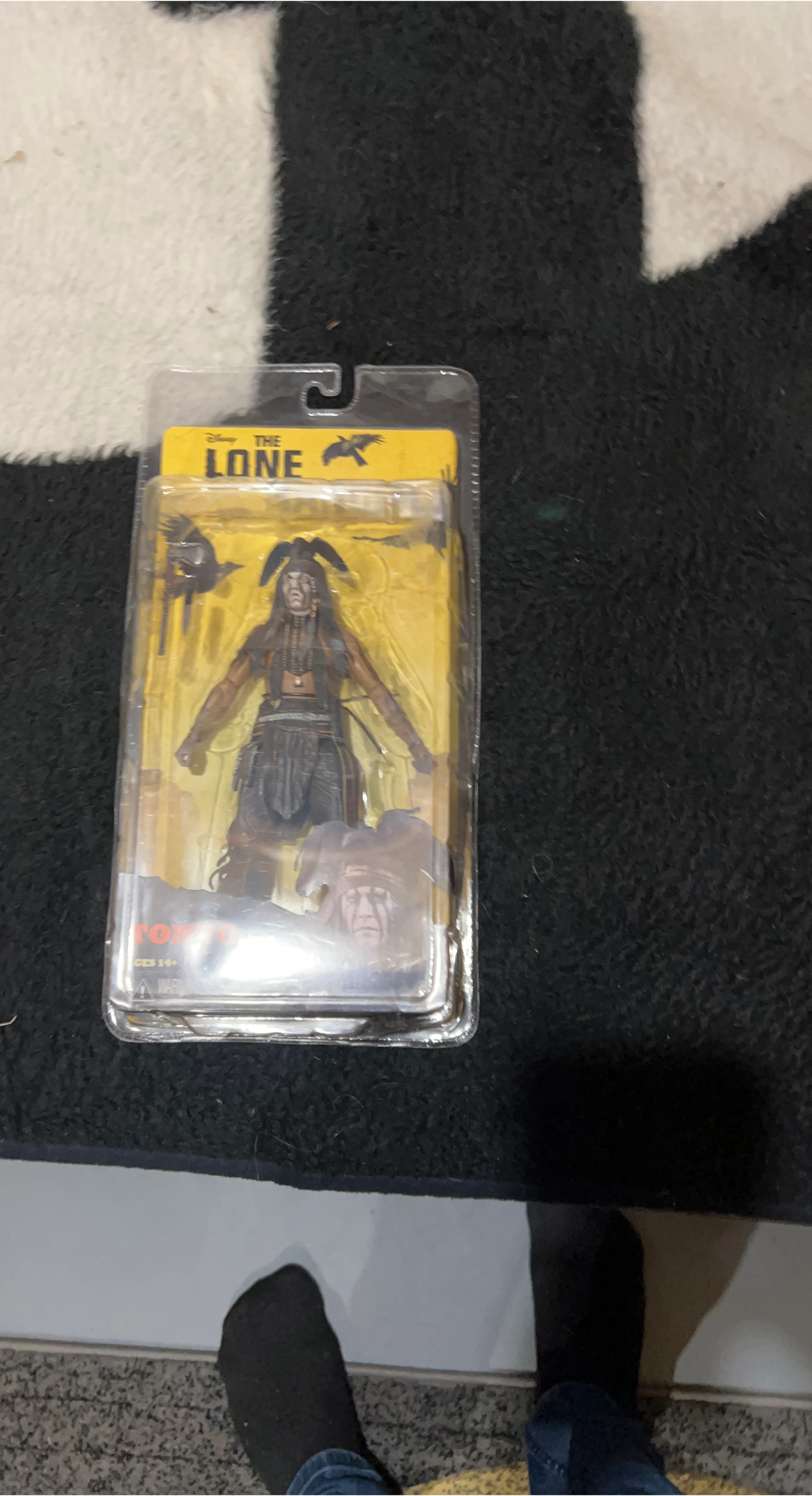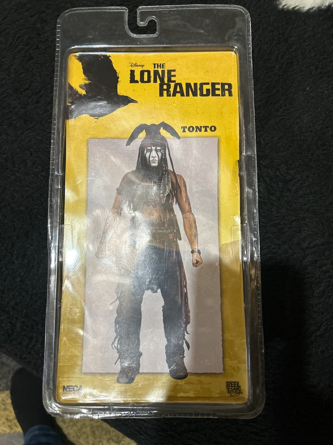 42Selling a Disney The Lone Ranger Tonto action figure by NECA Reel Toys. The packaging indicates it is suitable for ages 14+ and includes a warning about a choking hazard. It's in great shape!