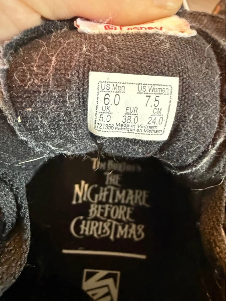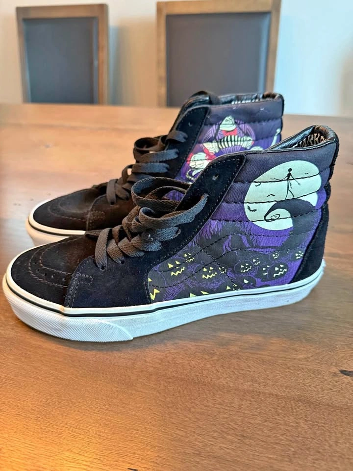 15Worn for an hour 1x! Brand New without Box. How cool are these Vans high tops, Nightmare Before Christmas edition High top board shoe design with all your favorite characters. Perfect for Disney, Nightmare Before Christmas, Halloween, or Tim Burton fans! Black suede with laces. Glow in the dark. Soles are in excellent condition Unisex; Size is Men's 6 or Women's 7.5