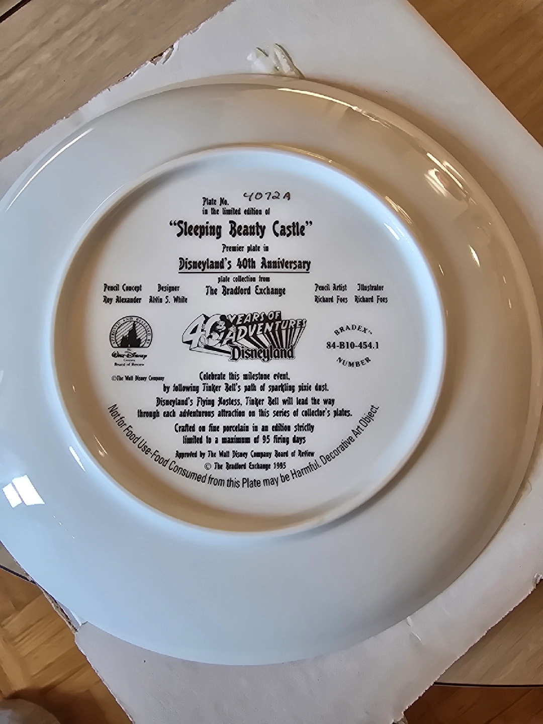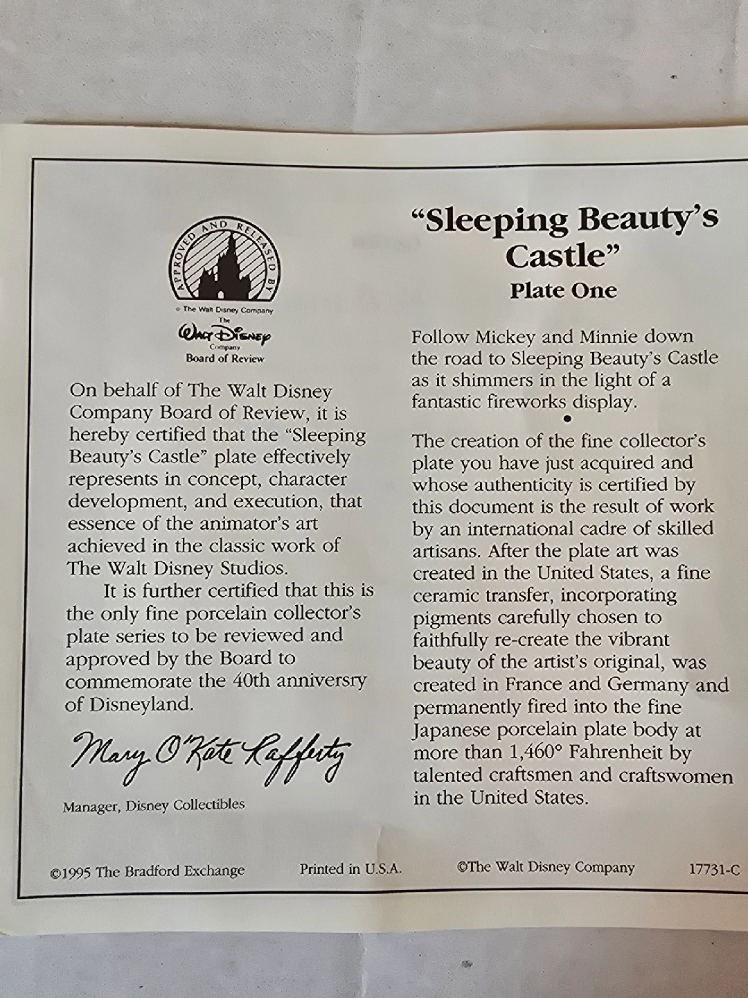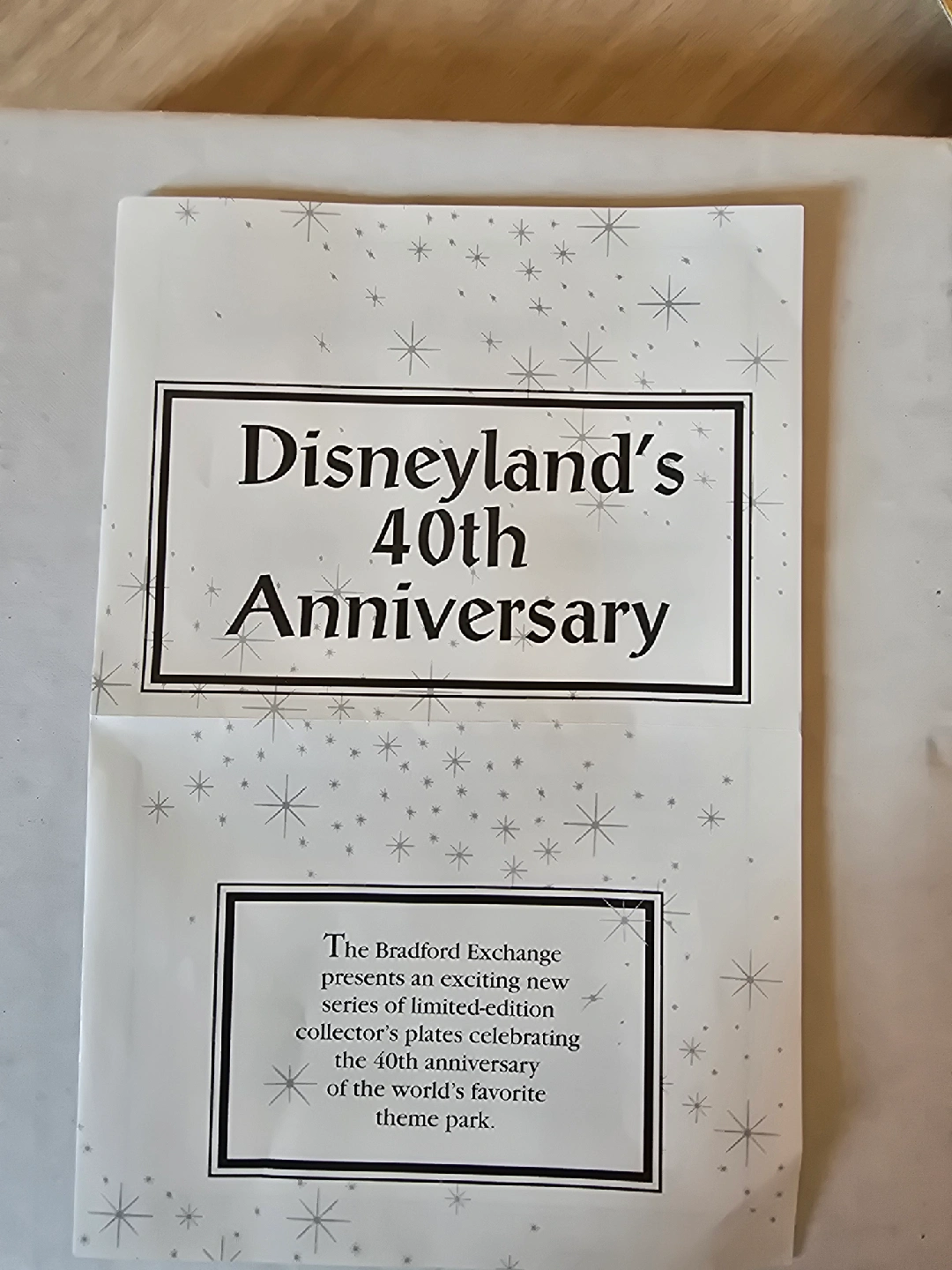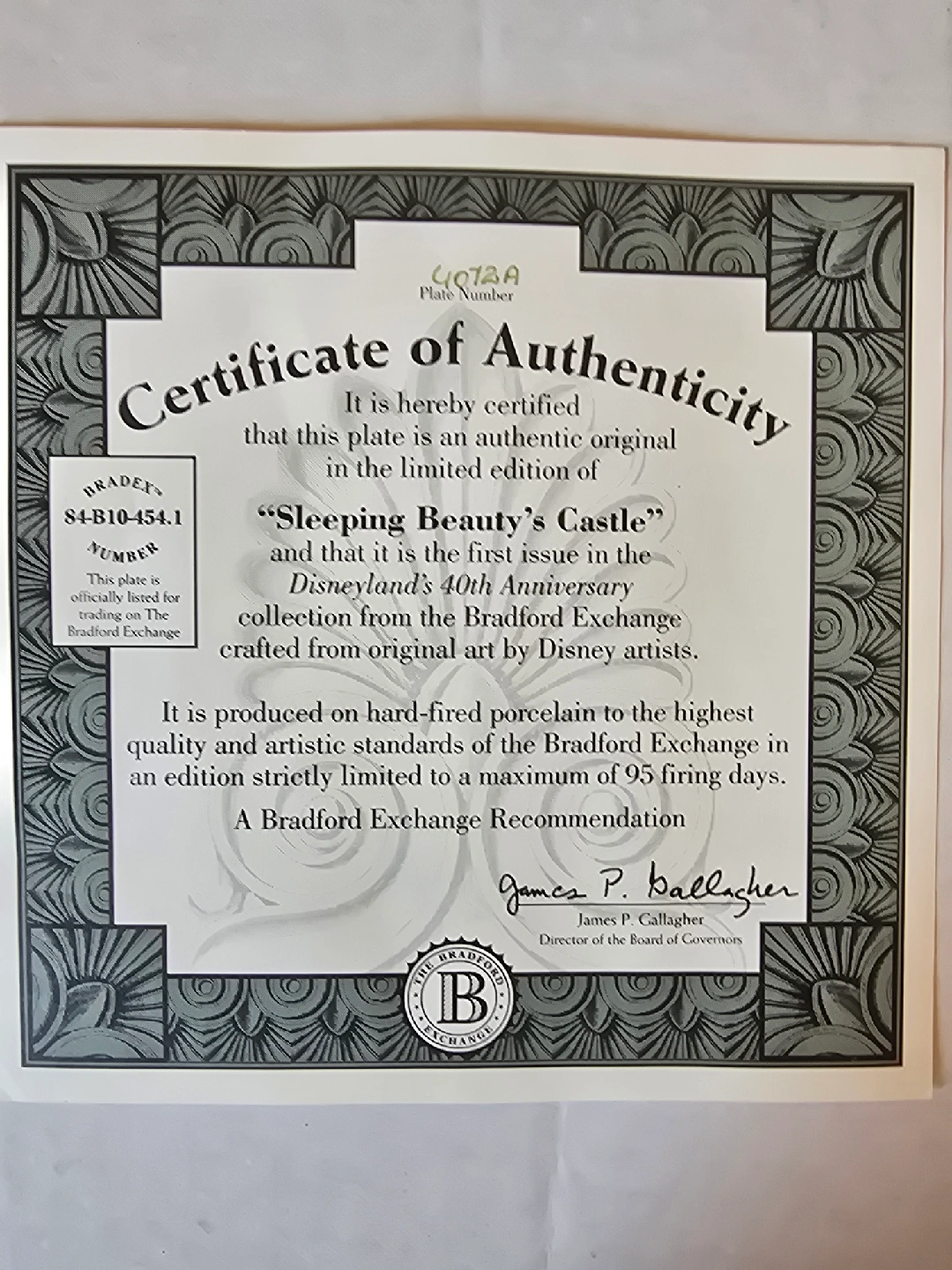 65Selling a beautiful collector's plate commemorating Disneyland's 40th Anniversary! This limited-edition plate from The Bradford Exchange features "Sleeping Beauty's Castle" and is crafted from fine porcelain. It's officially listed for trading on The Bradford Exchange. A great piece for any Disney fan or collector!