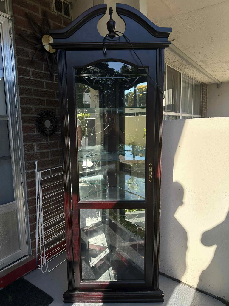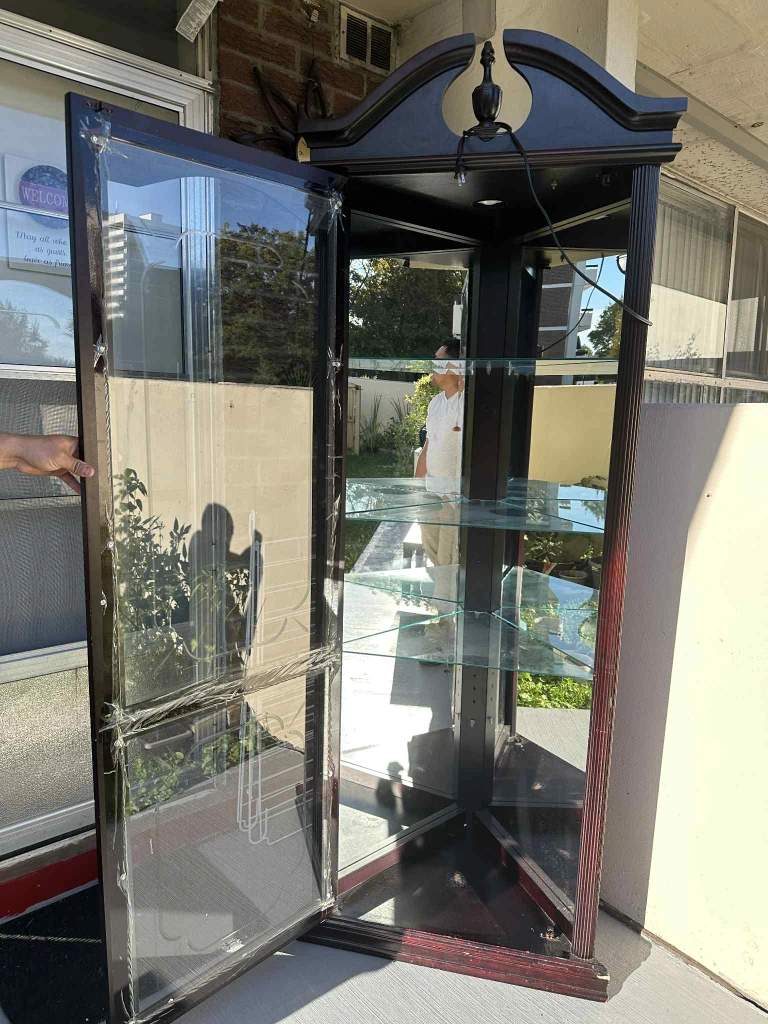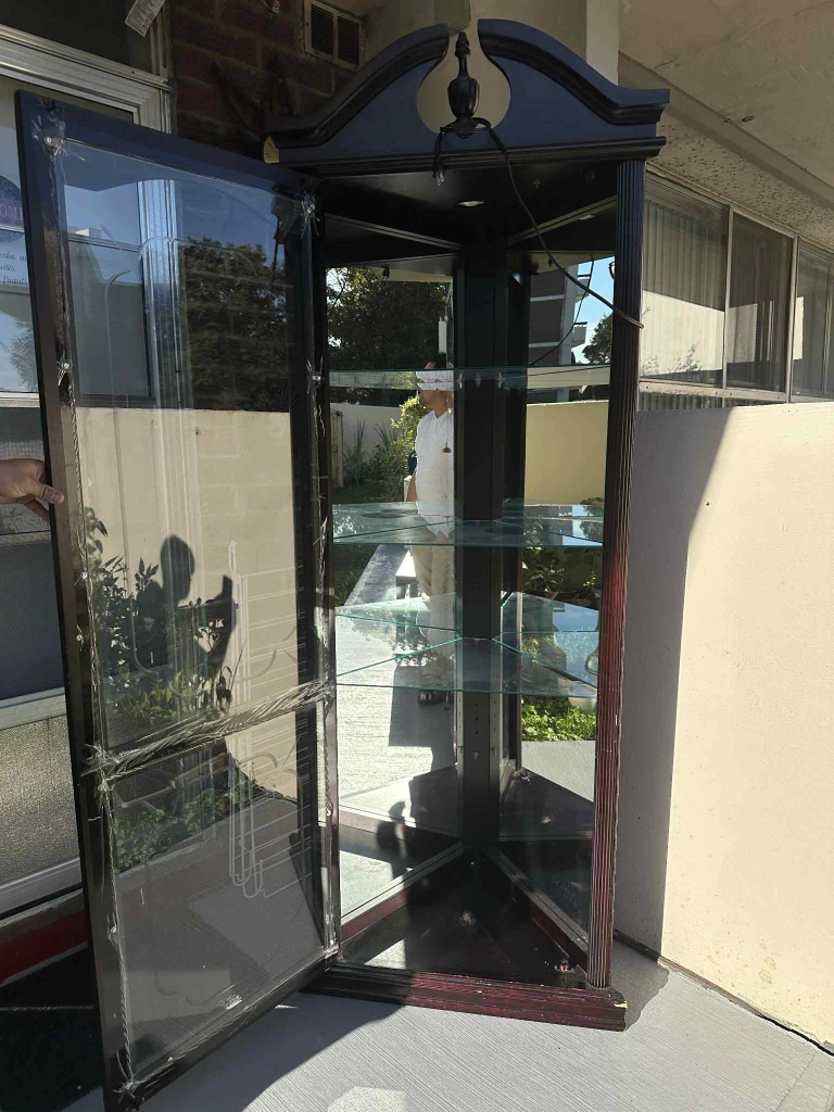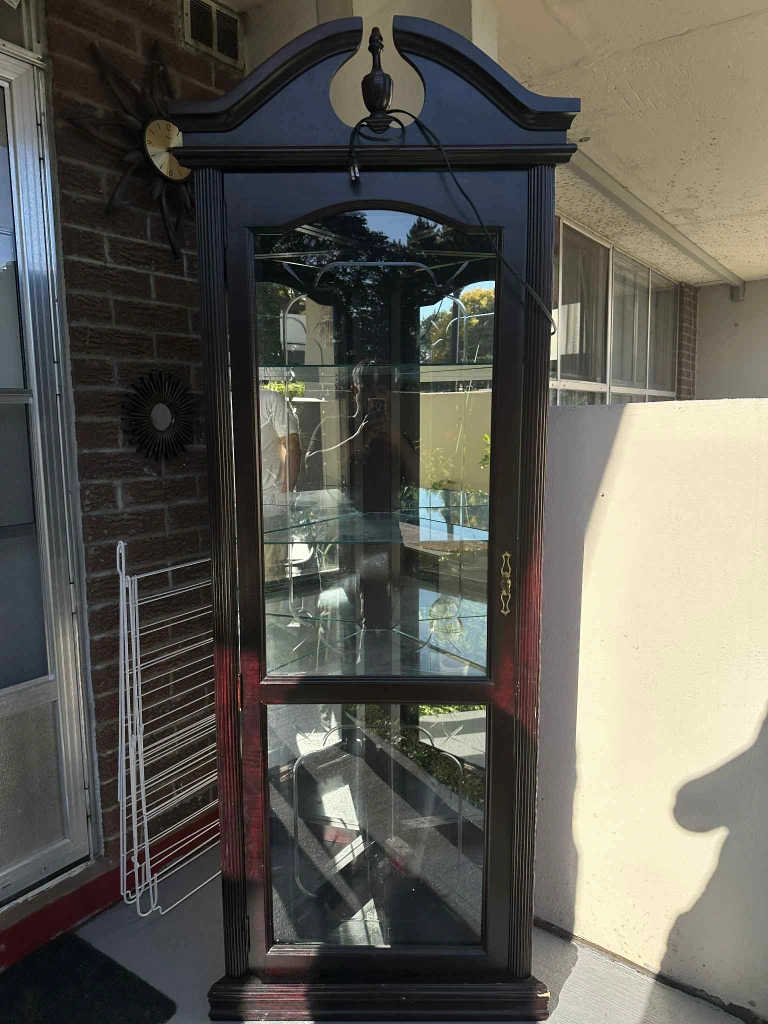 Selling a display cabinet with glass shelves. It's perfect for showcasing your collectibles or favourite items. The cabinet is in good condition and has a classic design that would fit well in any home. It features a dark wood finish and a glass door to keep your items dust-free. The shelves are adjustable to accommodate different sized items.