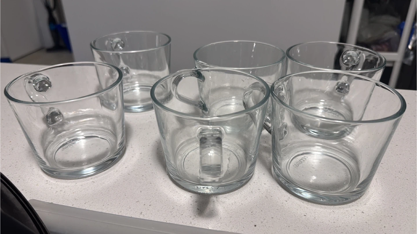 Here's a set of six clear glass mugs, each with a comfortable handle. They're made from durable glass and are perfect for enjoying your favourite hot or cold beverages. These mugs are ideal for everyday use or for serving guests.