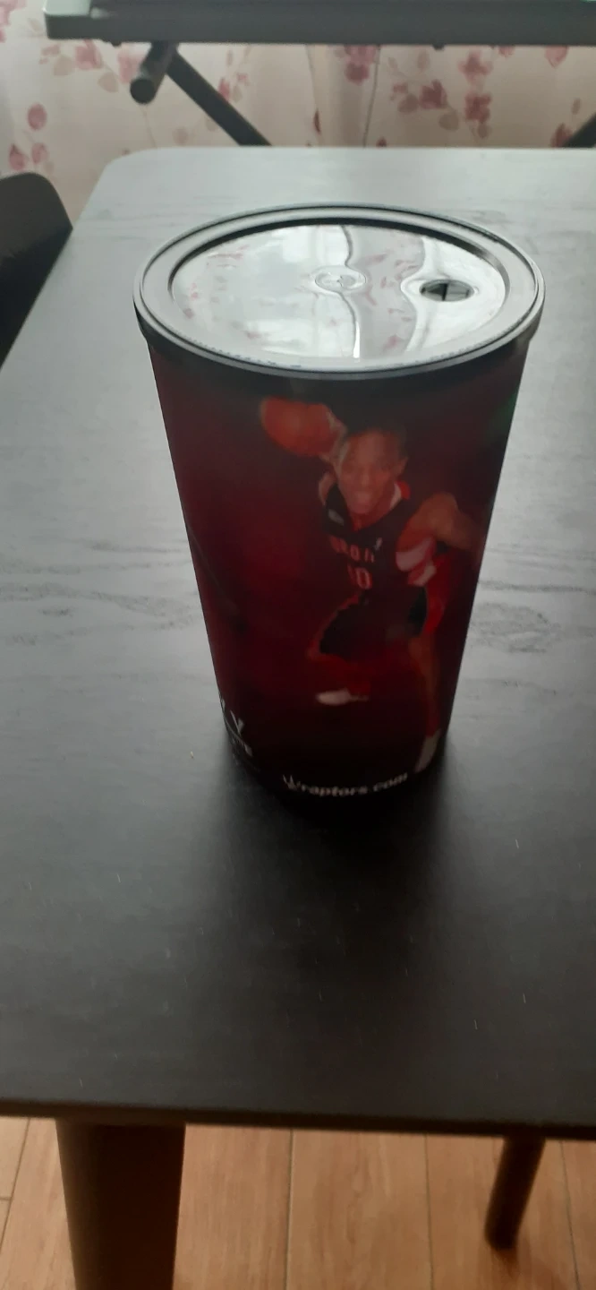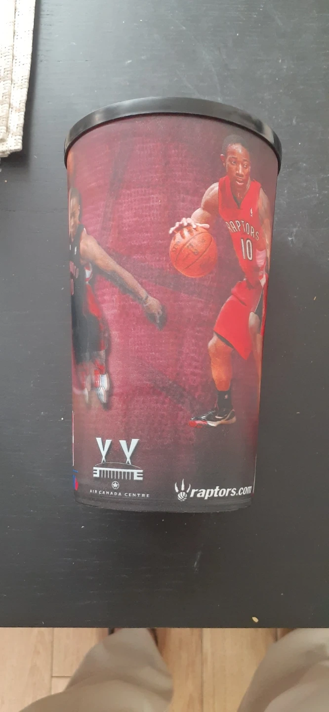 This reusable cup features Toronto Raptors players. It has a clear plastic lid with a sip opening. Perfect for game days!