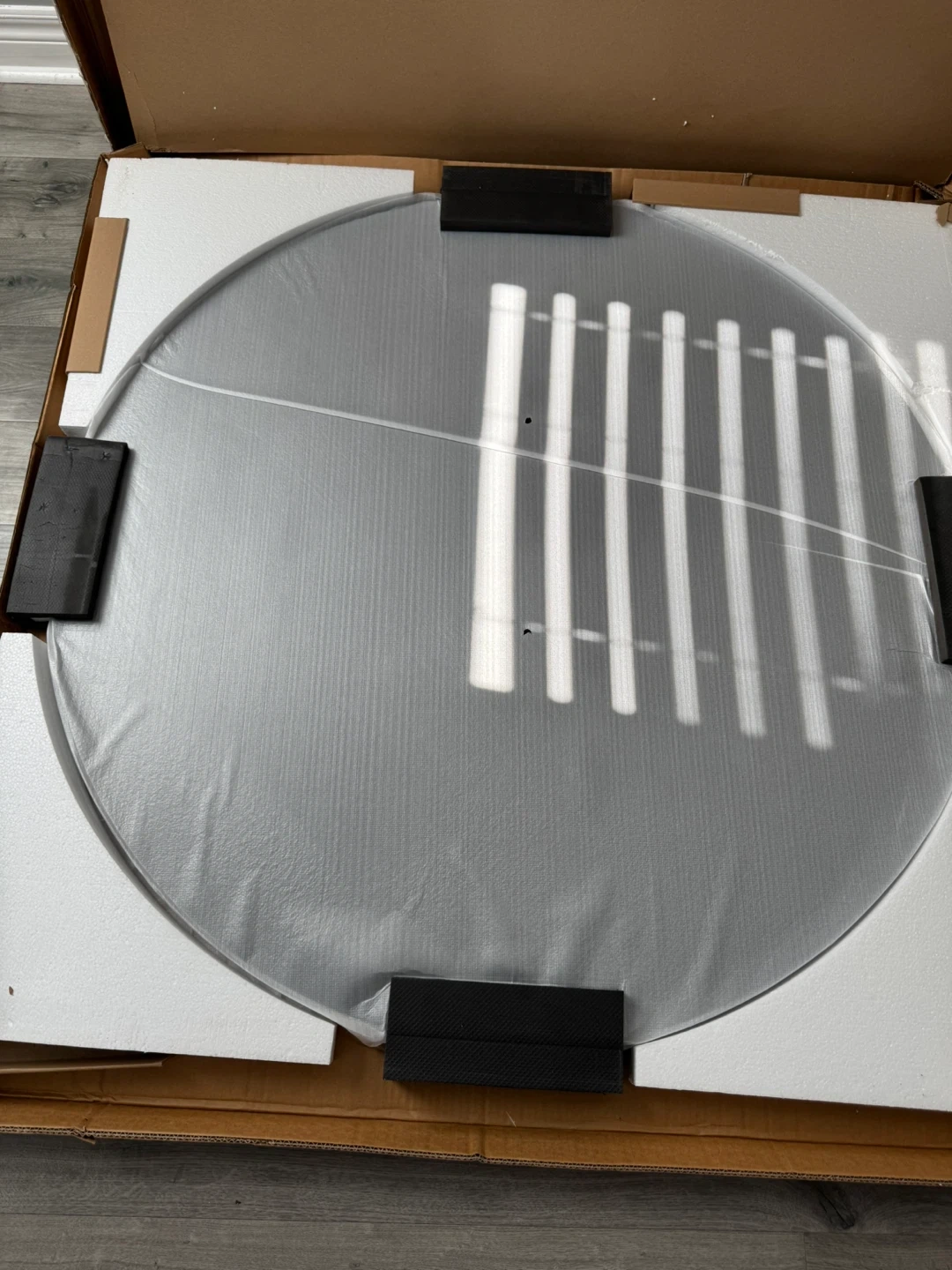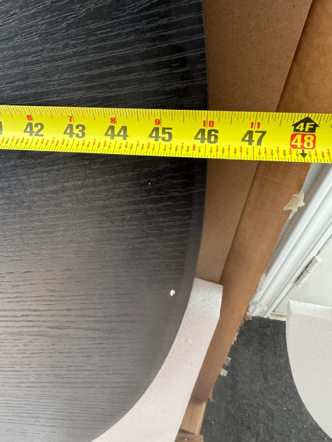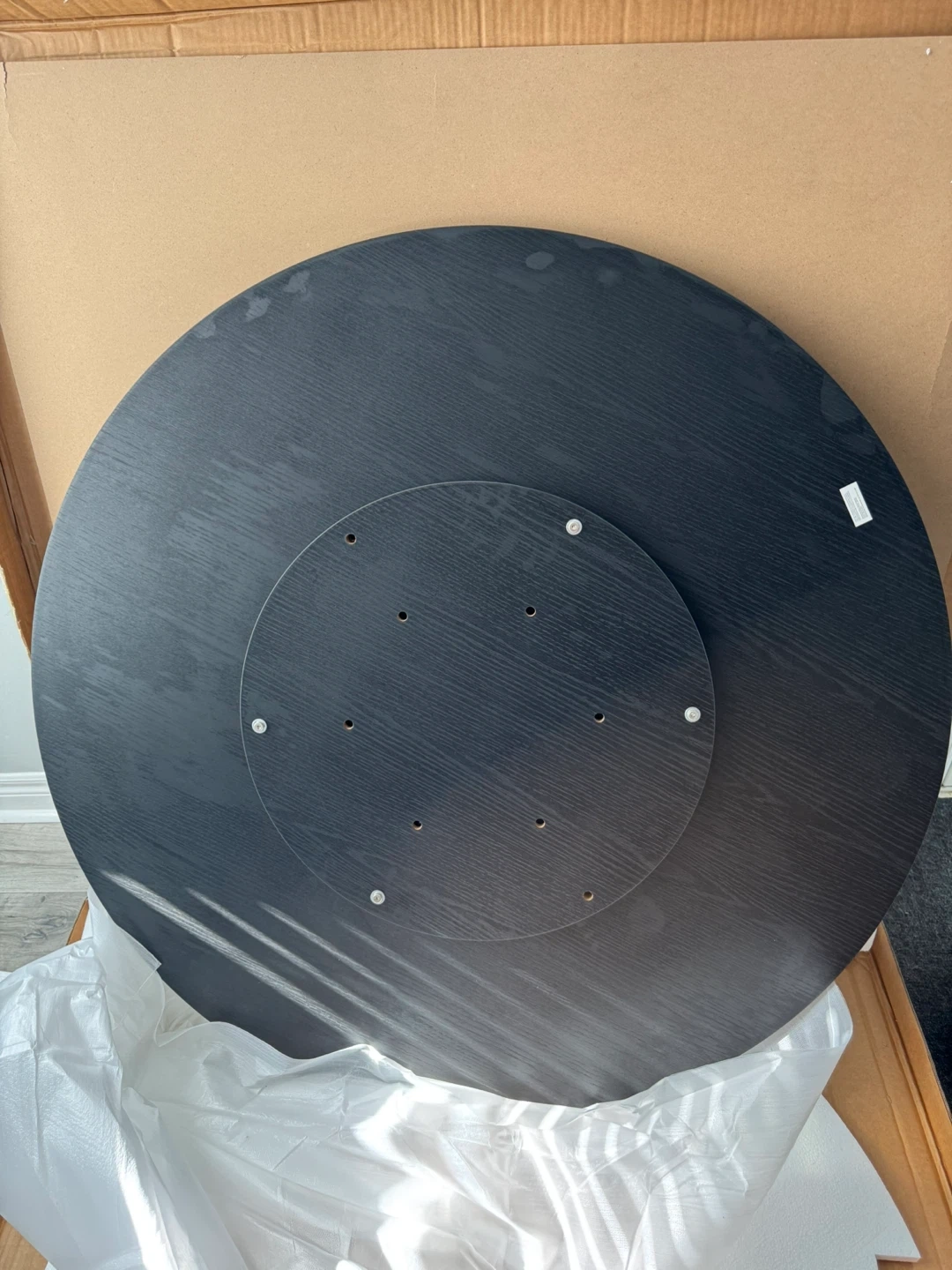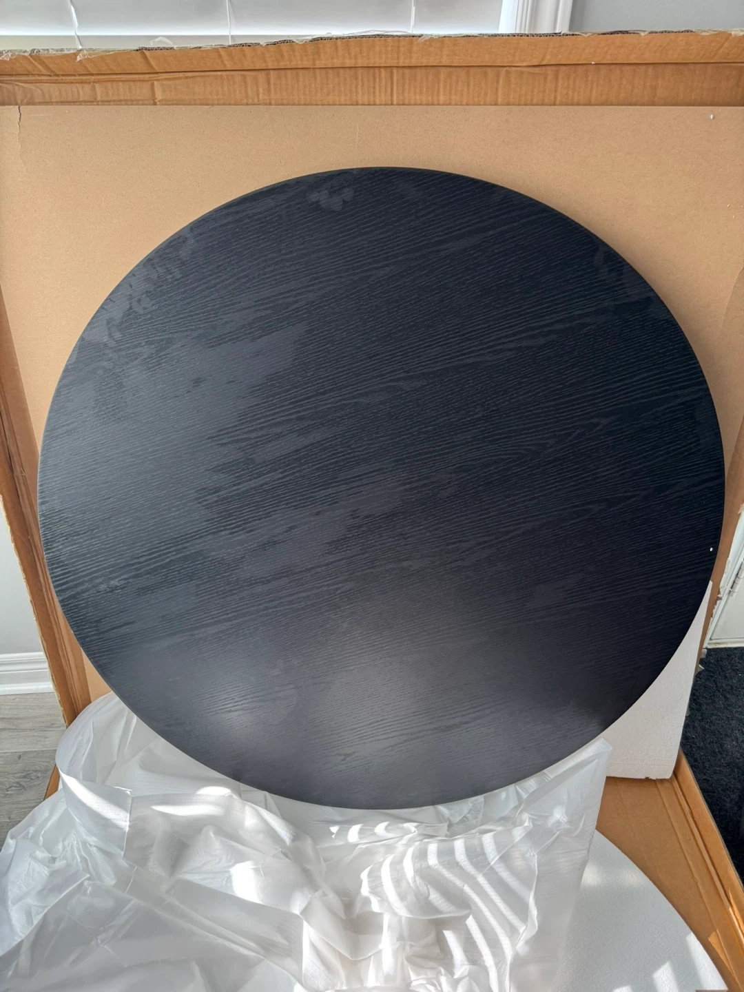This is a black round coffee table top. It measures approximately 46 inches in diameter. The top has a wood grain finish and comes with protective packaging.