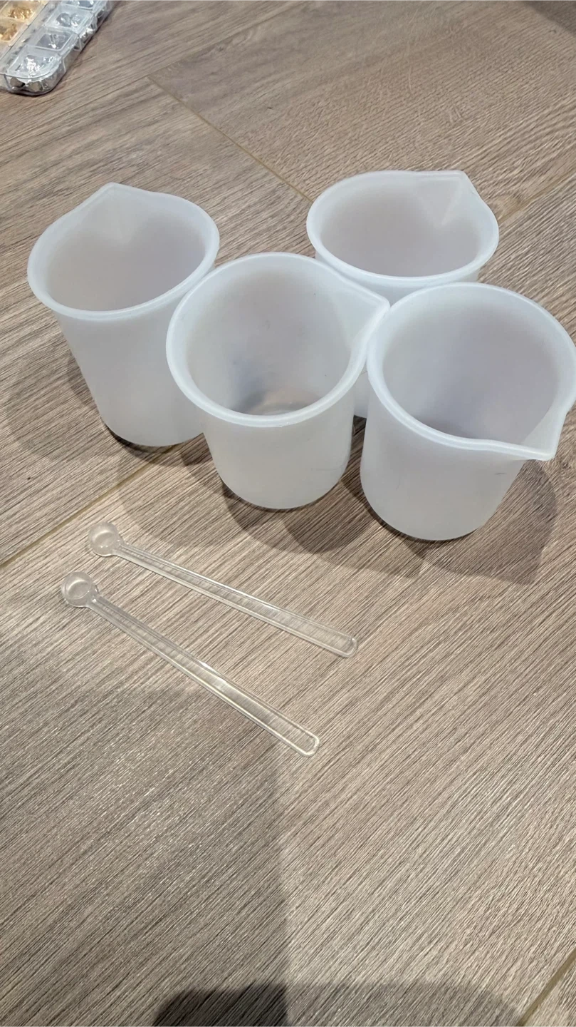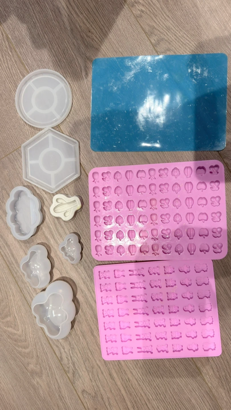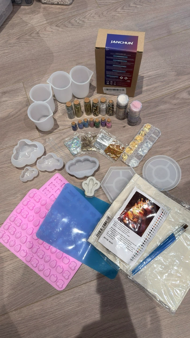 70Take all for $40. Items can be sold separately, price for individual items listed below. 1. Paint by number set (with brushes and paint) - $6 2. 16oz unopened resins - $10 3. Cloud card mold - $2 4. A set of 3 cloud mold - $4 5. One various animal mold - $2 6. One various fruit mold - $2 7. A circle coaster mold - $2 8. A hexagon coaster mold - $2 9. 100ml silicon measuring cup x 4 - $8 for all 10. Mini scoop x 2 - $2 for all 11. Small silicon mat - $2 12. Glitter in various colors - $10 for all 13. Gold and silver foil - $4 14. A cactus mold - $2