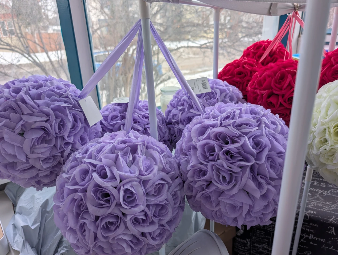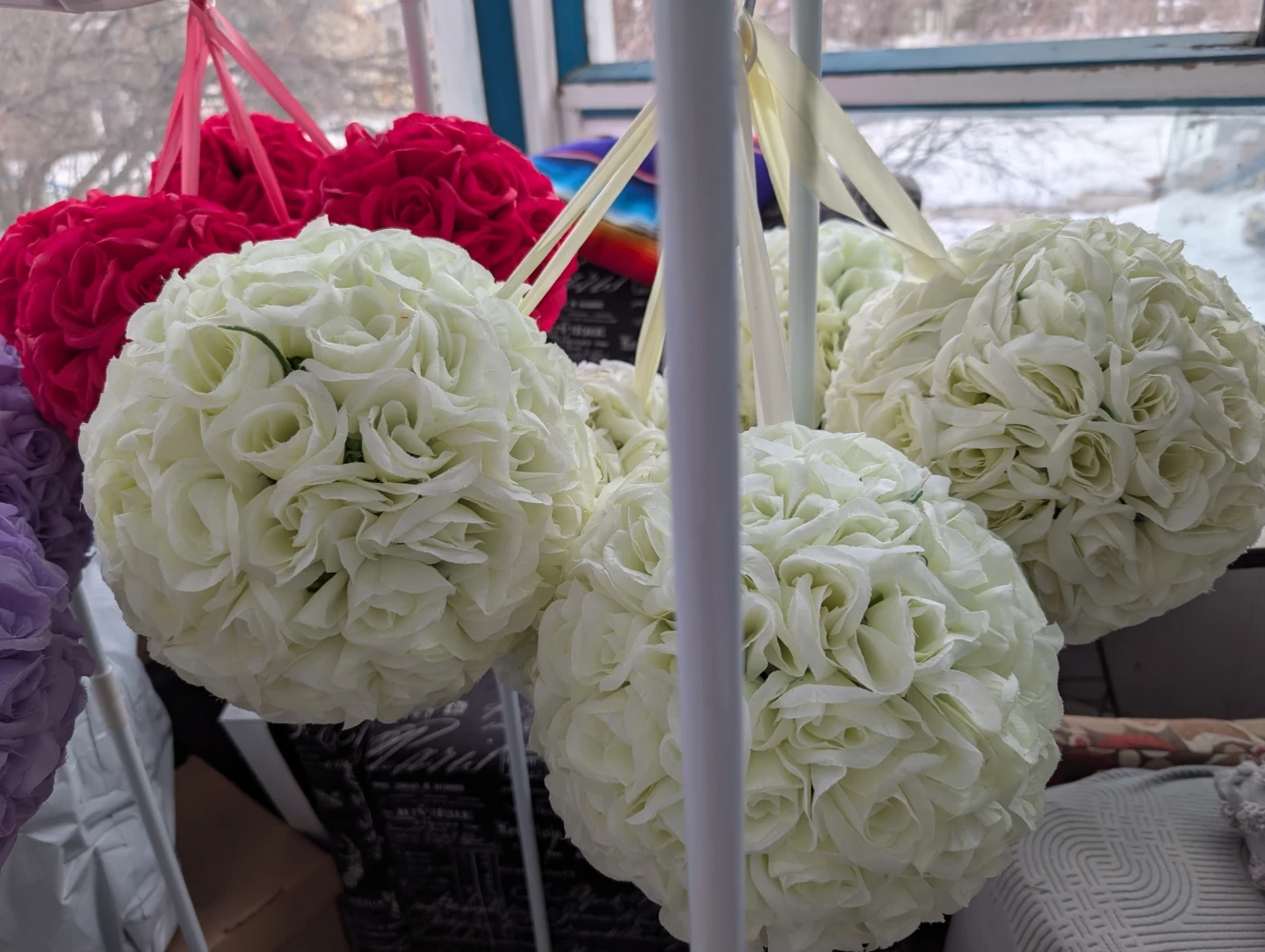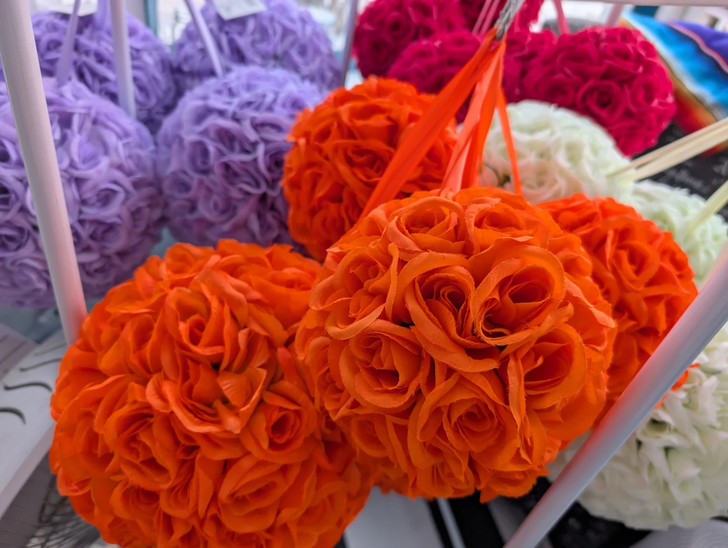 These decorative floral kissing balls are made to look like roses. They come in various colours and have ribbon loops for hanging. They're perfect for adding a romantic touch to events or decor.