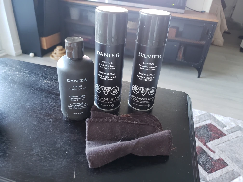 Two cans of Danier Defense Spray and one bottle of Danier Renewal Lotion. Includes one black cloth. For prolonging the life of leather.