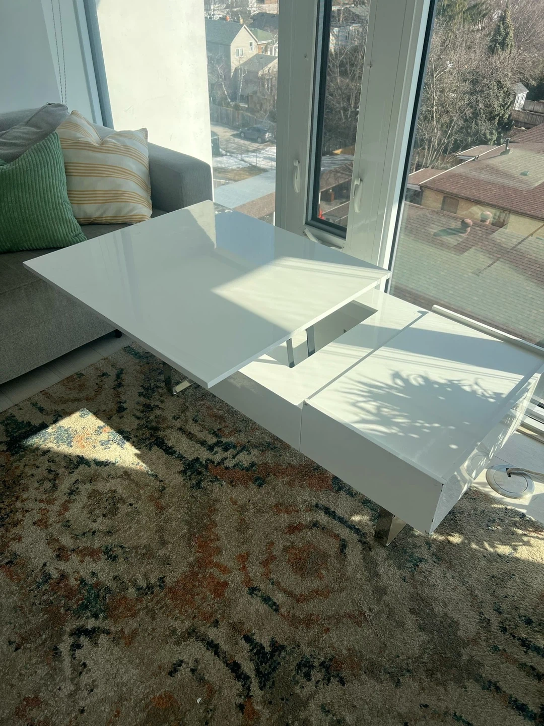 Selling a modern lift-top coffee table! It's perfect for small spaces and adds a touch of elegance to any living room. It has a white finish and a lift-top design, making it ideal for working or enjoying a meal while relaxing on the couch. Please note that there are some signs of wear and tear as shown in the pictures.