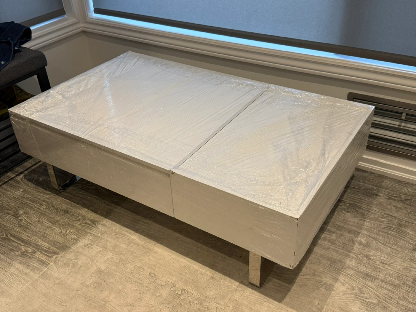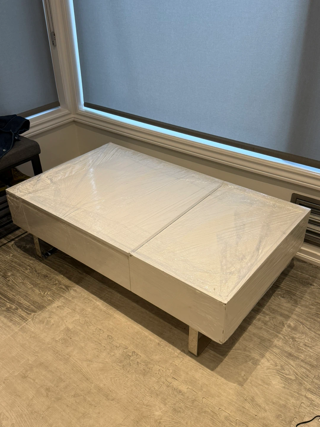 Selling a modern lift-top coffee table! It's perfect for small spaces and adds a touch of elegance to any living room. It has a white finish and a lift-top design, making it ideal for working or enjoying a meal while relaxing on the couch. Please note that there are some signs of wear and tear as shown in the pictures.