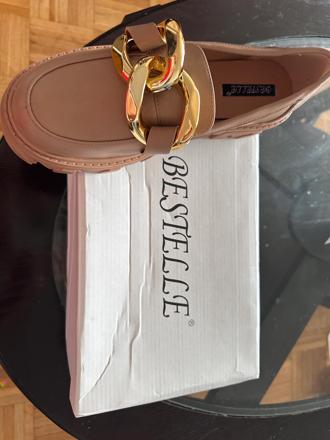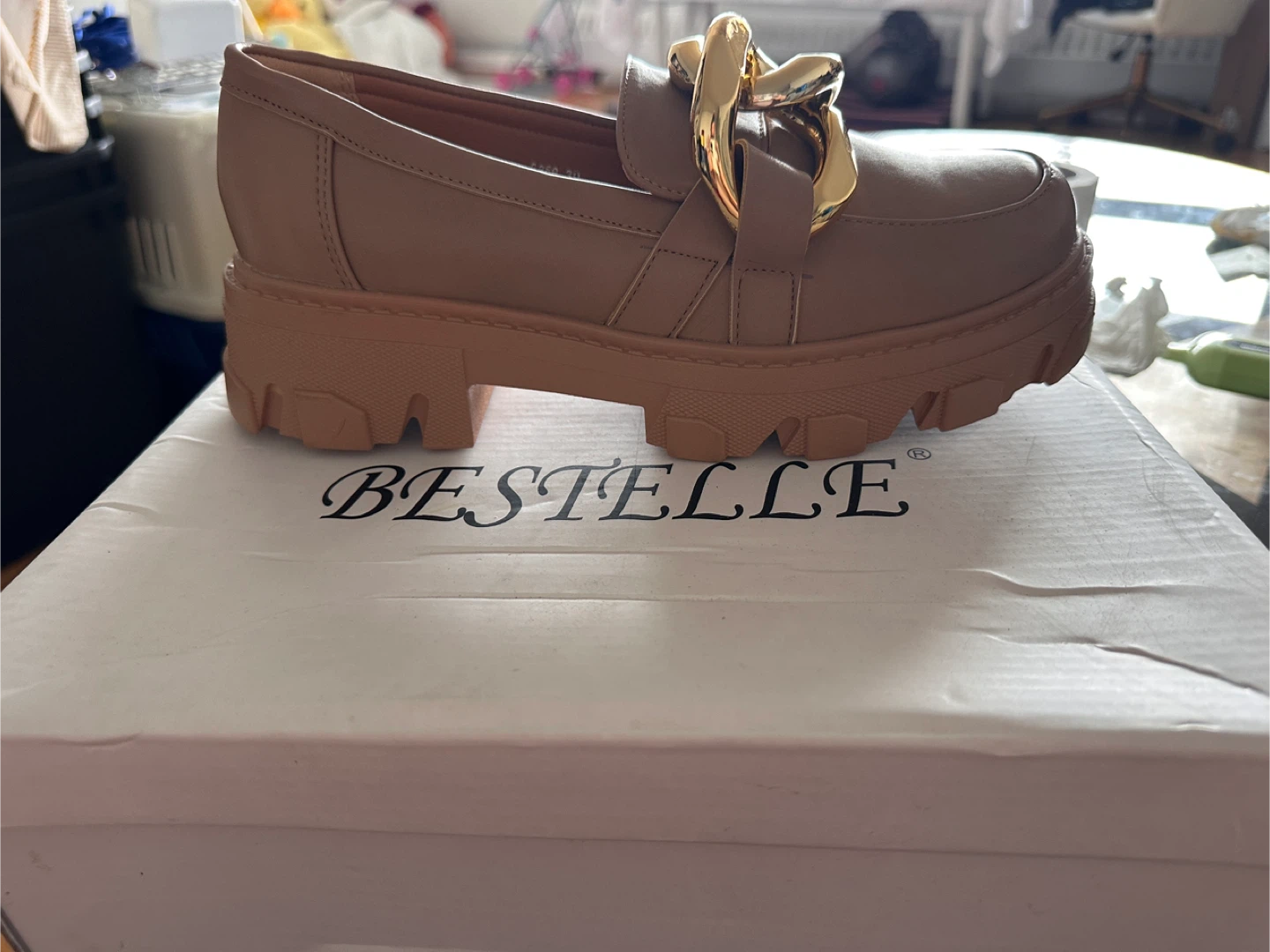 These stylish tan loafers feature a chunky gold chain accent and a durable lug sole. They're made from a faux leather material. Perfect for adding a fashionable touch to any outfit! Brand new, never worn!!