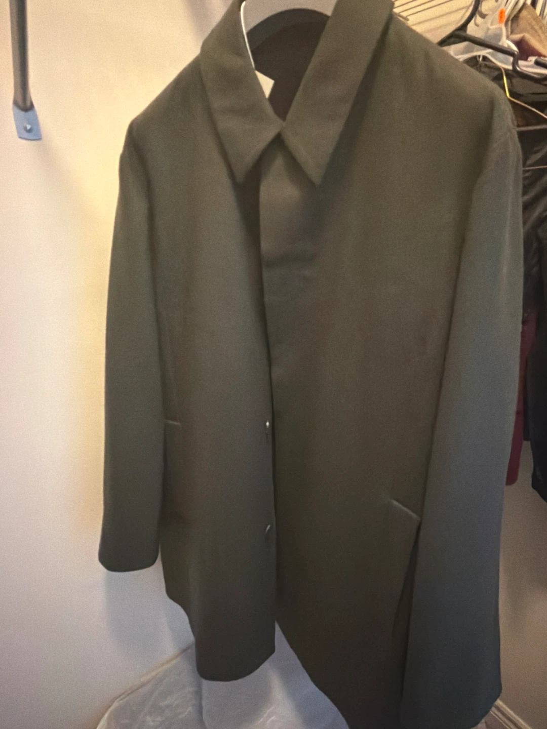 A sharp, dark green new COS blazer for men. It features a classic collar and two button closure. Made with a smooth fabric, it's suitable for semi-formal occasions.
