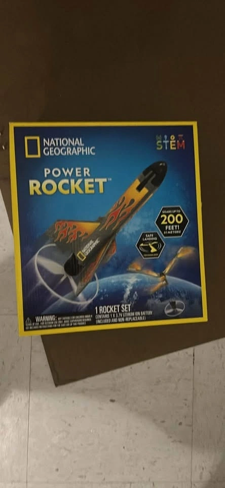 Experience the excitement of flight with the National Geographic Power Rocket, a motorized air rocket launcher. Unlike traditional rockets, this one has a rechargeable electric motor, giving you up to 20 launches on a single charge. Choose from 3 different flight modes to control how high the rocket flies, reaching up to 200 feet. The safe-landing system deploys wings that twirl like a helicopter, bringing the rocket back down gently. Customize your rocket with 3 included decal sheets. The kit also comes with a detailed learning guide about the science of flight. Recommended for ages 8 and up, this kit includes the Power Rocket, Launch Base, Charging Cable, Decal Sheets, and instructions. This rechargeable, motorized rocket toy soars up to 200 ft. and delivers up to 20 flights on a single charge. Launch your rocket to 3 different heights with a simple push of a button. The innovative design includes helicopter-like rotor blades that extend and safely return your motorized rocket to the ground. This exciting outdoor toy includes the launch pad, charging cable, and decals for a custom look.
