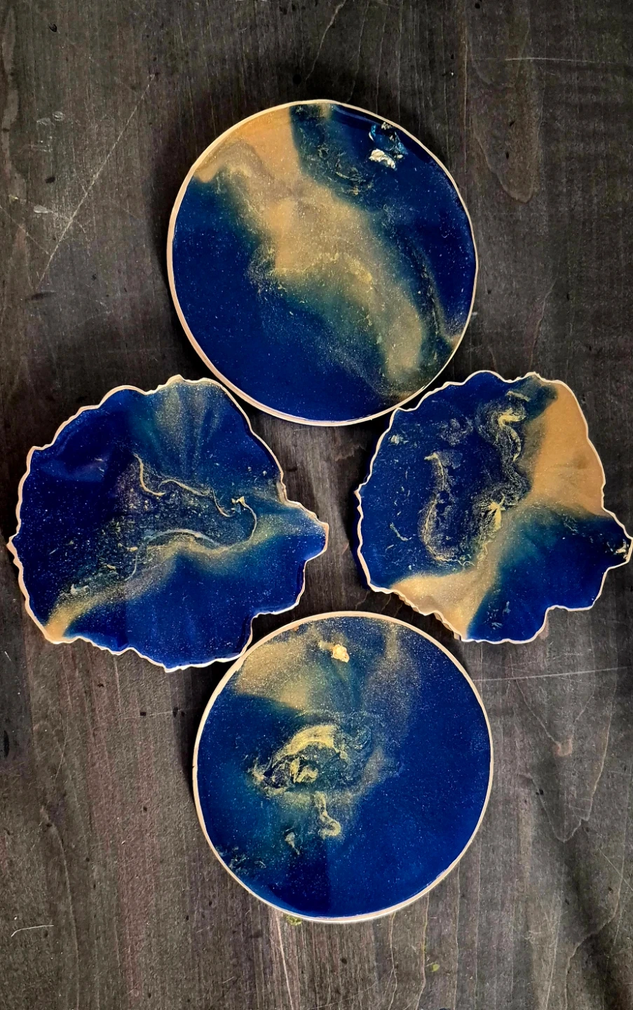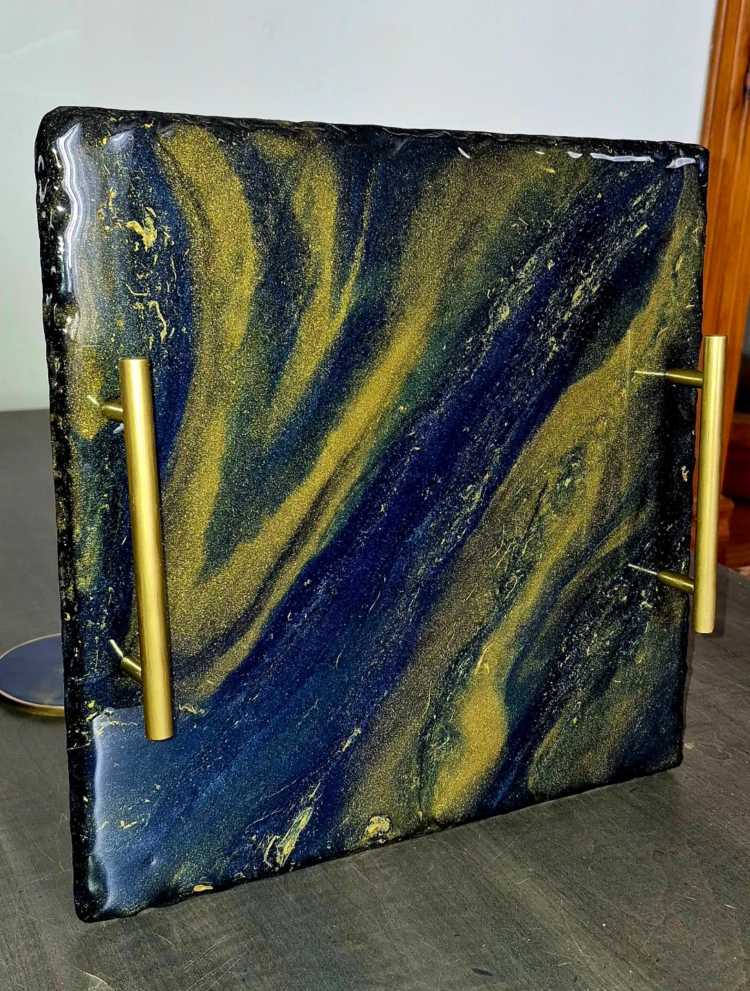 Decorative serving tray and four coasters with a striking blue and gold marbled design. The tray features sturdy gold-toned handles. This set is made from resin and adds a pop of colour to any tabletop.
