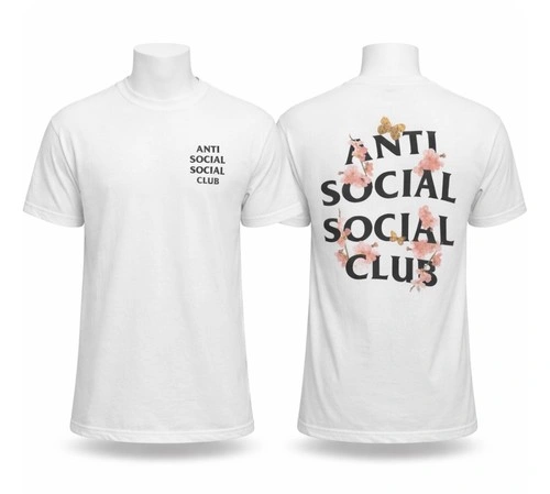 Anti Social Social Club (ASSC) Kkoch T-shirt in white. Features the brand's signature logo with cherry blossoms and butterflies. Color: White with pink floral/butterfly graphics. Material: 100% Cotton. Crew neck, short sleeves, graphic screen print. Size: Medium. Preowned. Some fading on print. Small hole on left sleeve, see image.