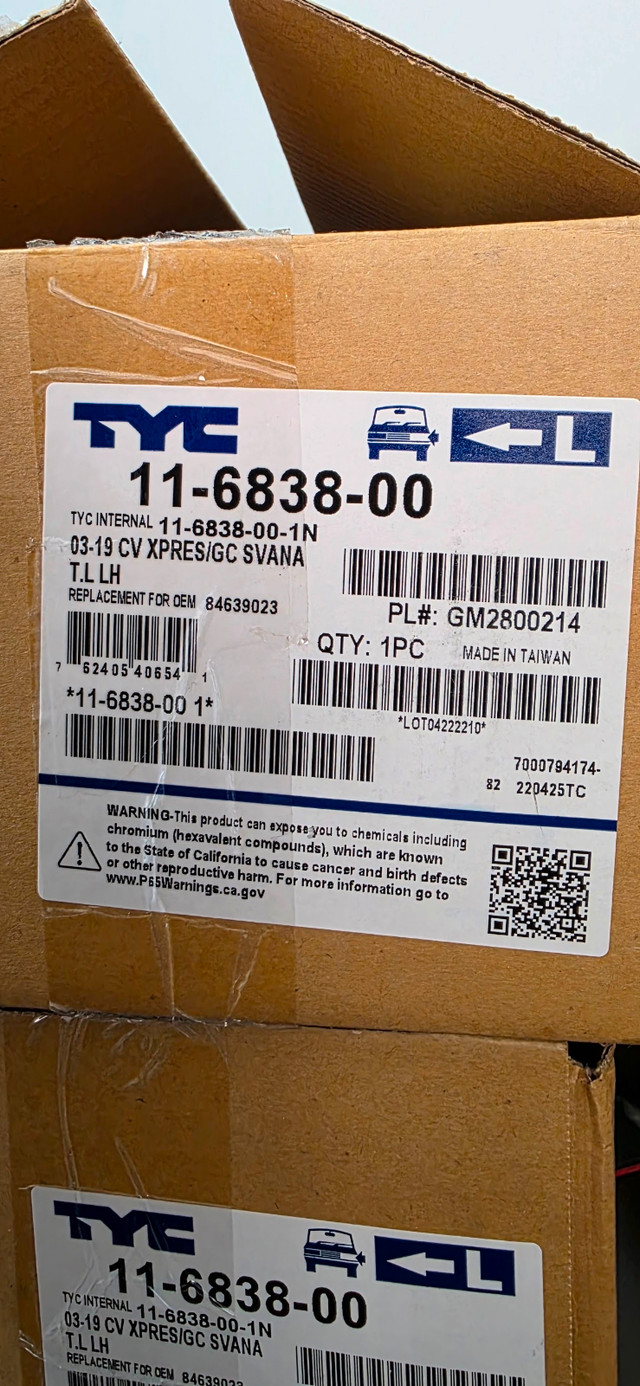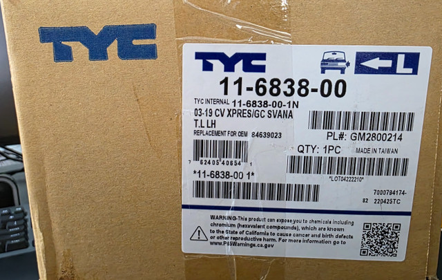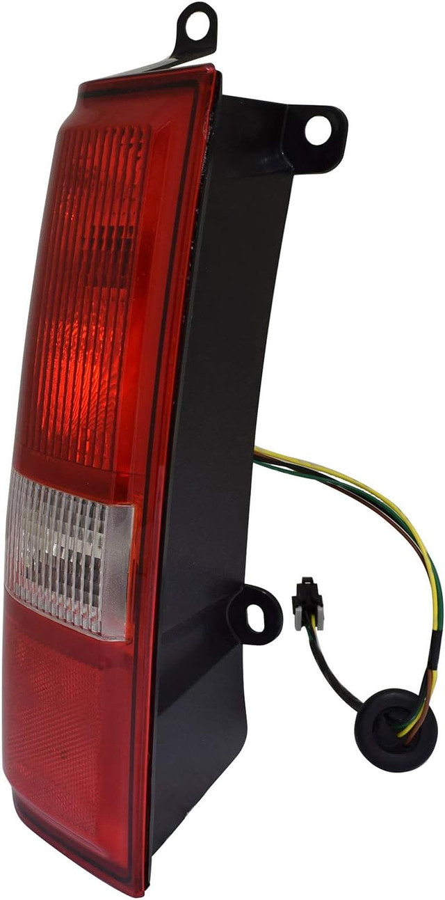 New TYC tail light for the rear outer left (driver's side). It's a halogen lamp with a red and clear lens. Fits Chevrolet Express and GMC Savana vans from 2003-2023.