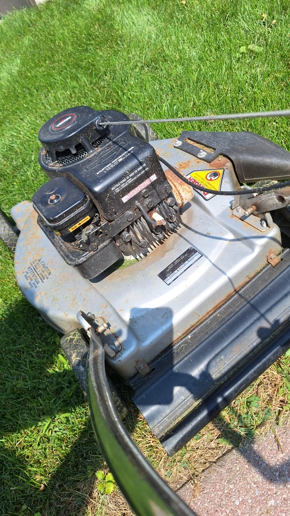 Gas powered lawn mower. Includes a safety switch and adjustable handle height. Starts easily. In good working condition