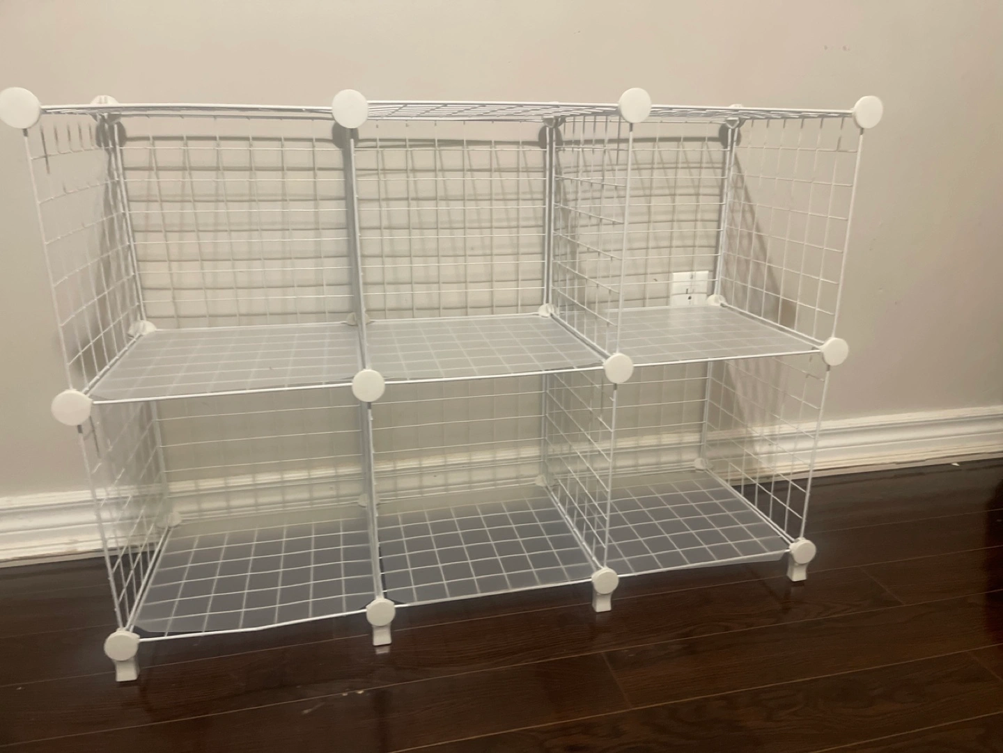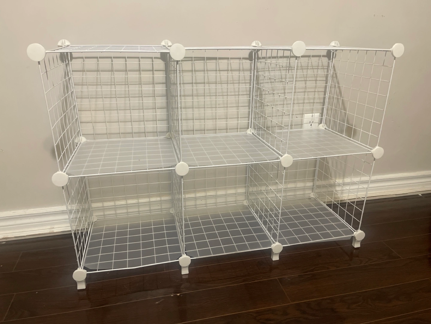White wire cube storage organizer. 6 cubes, 2 shelves. Great for organizing toys, books, or other items. Easy to assemble and disassemble.