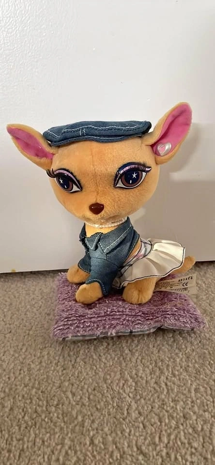 Barbie My Scene Churro Chihuahua plush dog from 2004. Includes a Jean Denim Hat, Skirt, and plush dog bed. Excellent, new condition.