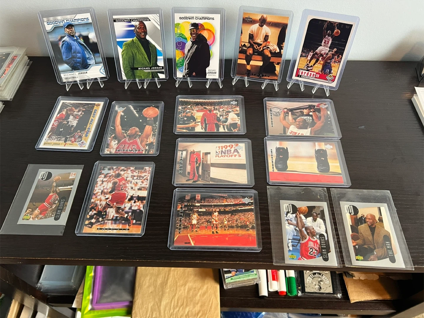 Selling a collection of Michael Jordan basketball trading cards/stickers. They are in protective cases and feature various images of Michael Jordan throughout his career.