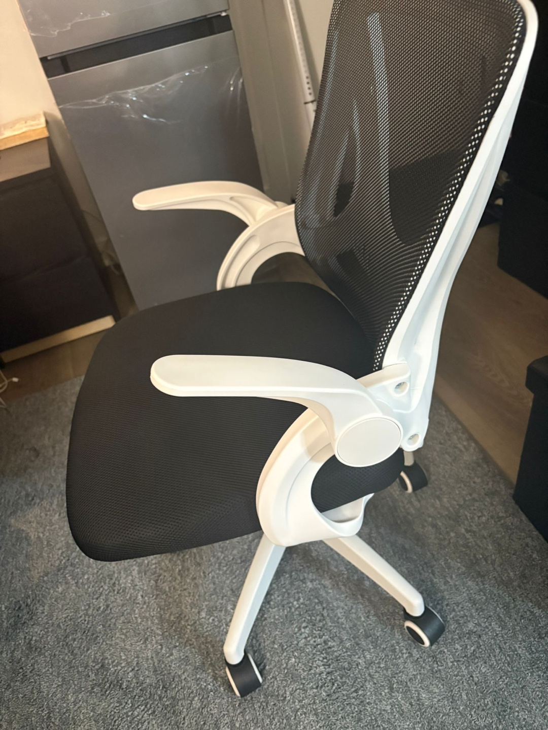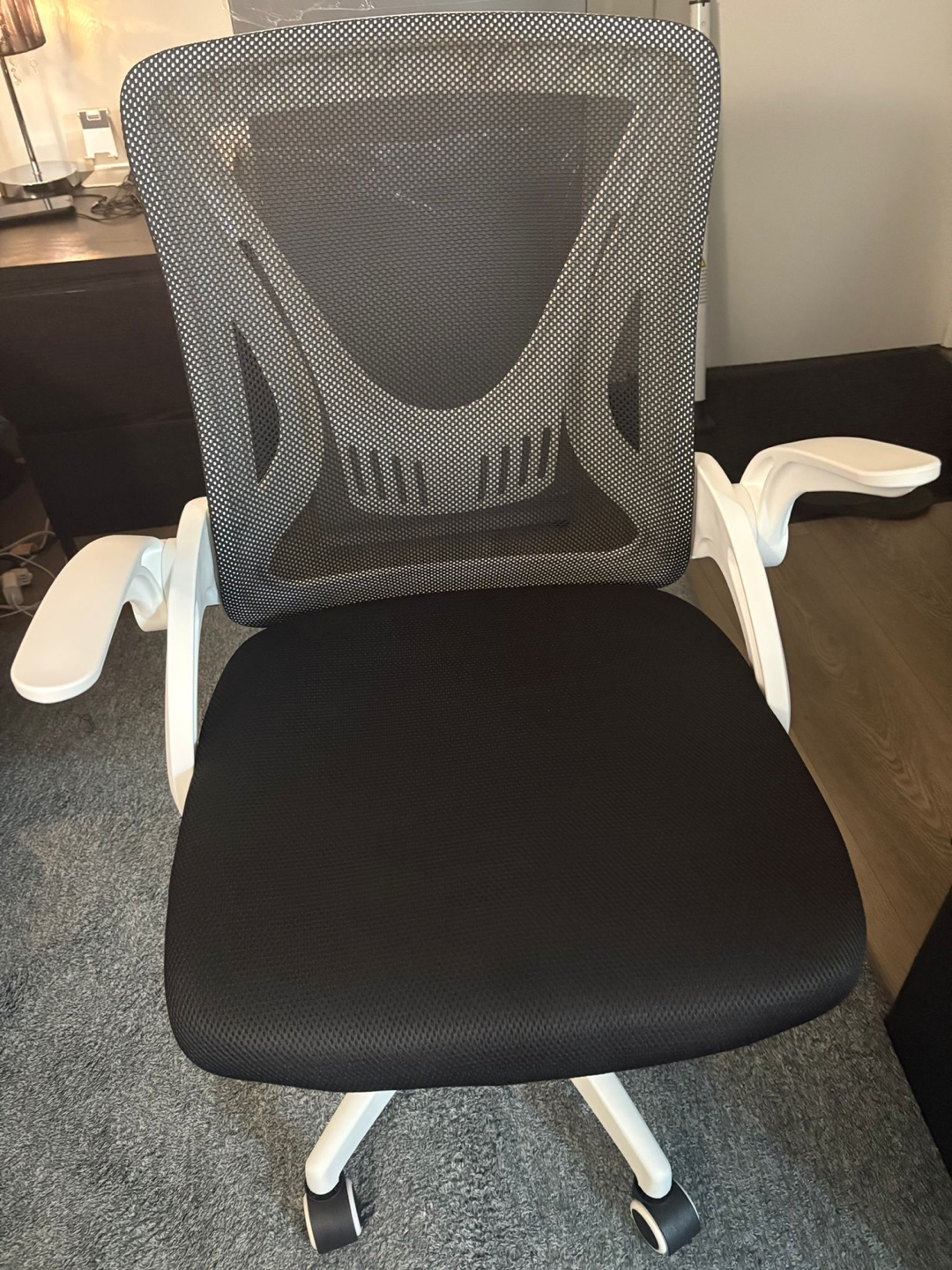 Selling a comfortable office chair with a white frame and black mesh back and seat. It's in great shape and ready for a new home office setup! The chair has adjustable armrests for added comfort.