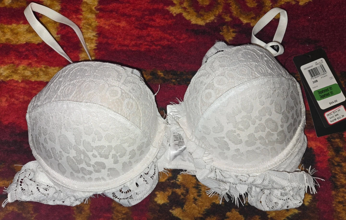 White lace push-up bra by Guess. It features underwire cups with higher wires on the sides and gradually padded cups. The straps are adjustable and it has a back closure. This bra offers a flattering lift and comfortable support.
