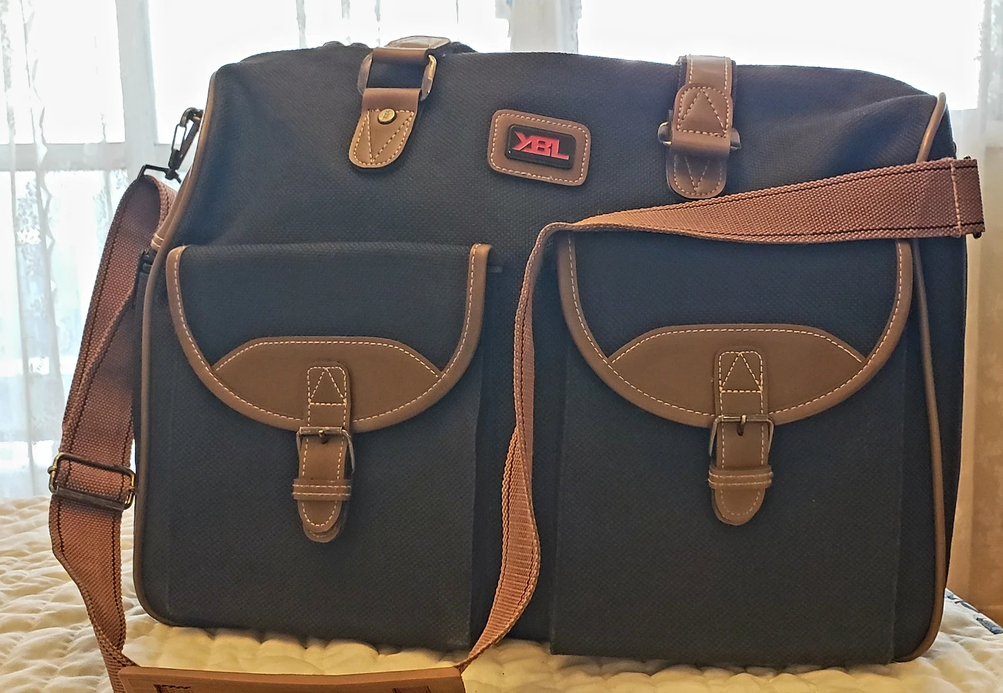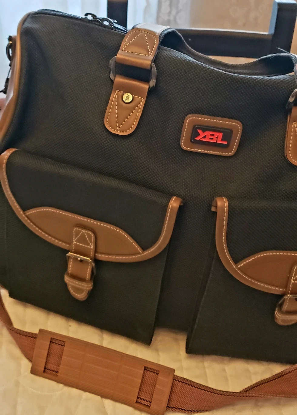 Duffel bag with hunter green canvas and brown leather. Leather handle, leather snaps, three outside compartments, large Inner zip closure pocket, with two short handles and an adjustable detachable shoulder strap.