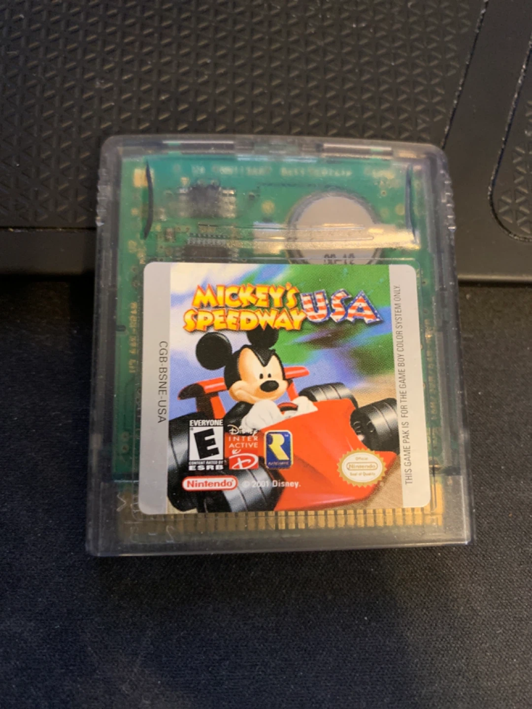 Mickey's Speedway USA for the Game Boy Color. This racing game features Mickey Mouse and friends. It's rated E for Everyone by ESRB. Game Pak is for the Game Boy Color system only.